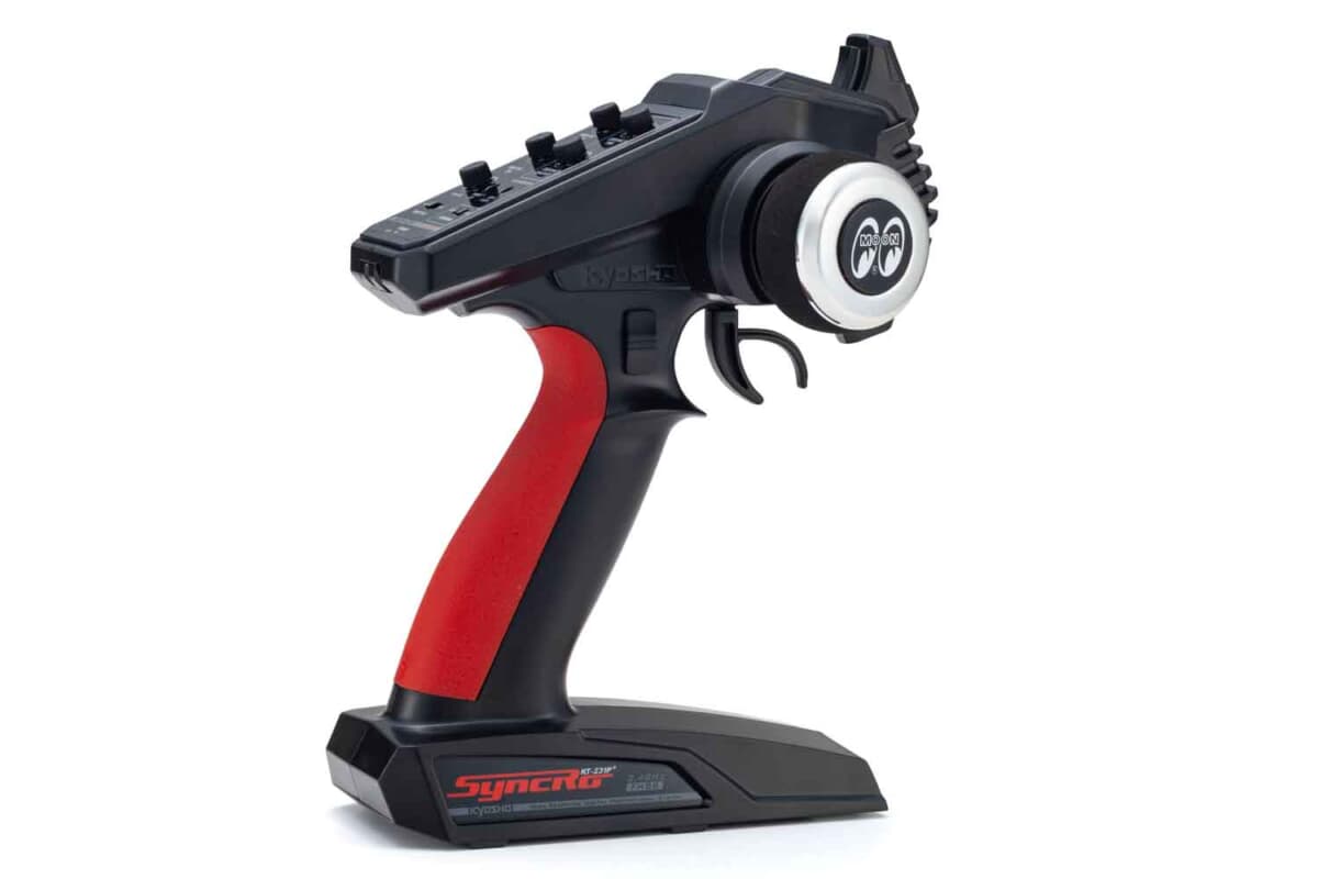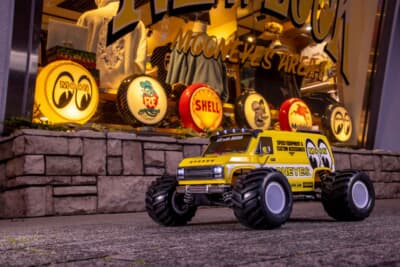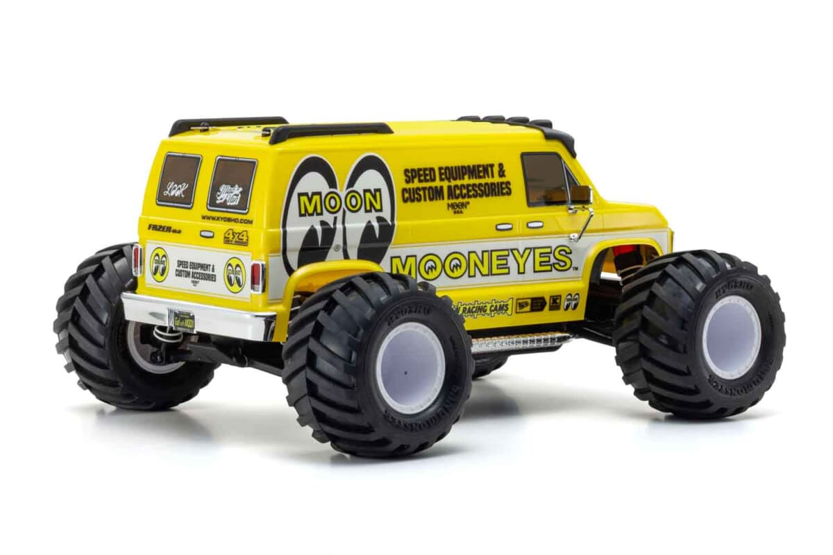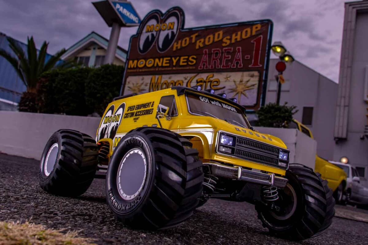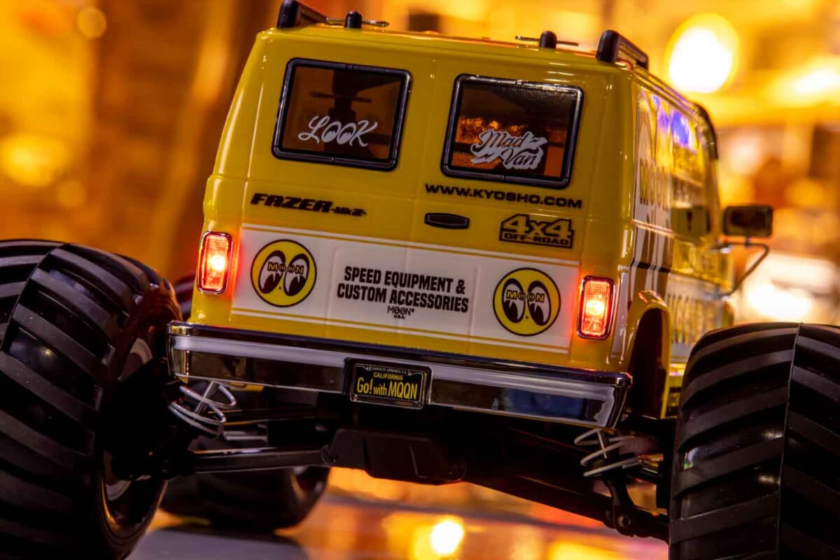 ご存知のように、アメリカのディーン・ムーンが創設したホットロッド&カスタムカルチャーの世界的ブランドがムーンアイズだ。その息吹は、このRCマシンであるマッドバンにも随所に散りばめられている。ボディはアイコニックなオリジナルカラーリングで彩られ、送信機のステアリングにはムーンディスクをモチーフにした特製ホーンキャップを装備。さらに、実物を模したライセンスプレートや、遊び心をくすぐるサイドマフラーまで備わっている。別売りのLEDライトユニットを装着できるようにバイザーも機能的にアップデートされており、手軽にライティングカスタムも楽しめる。