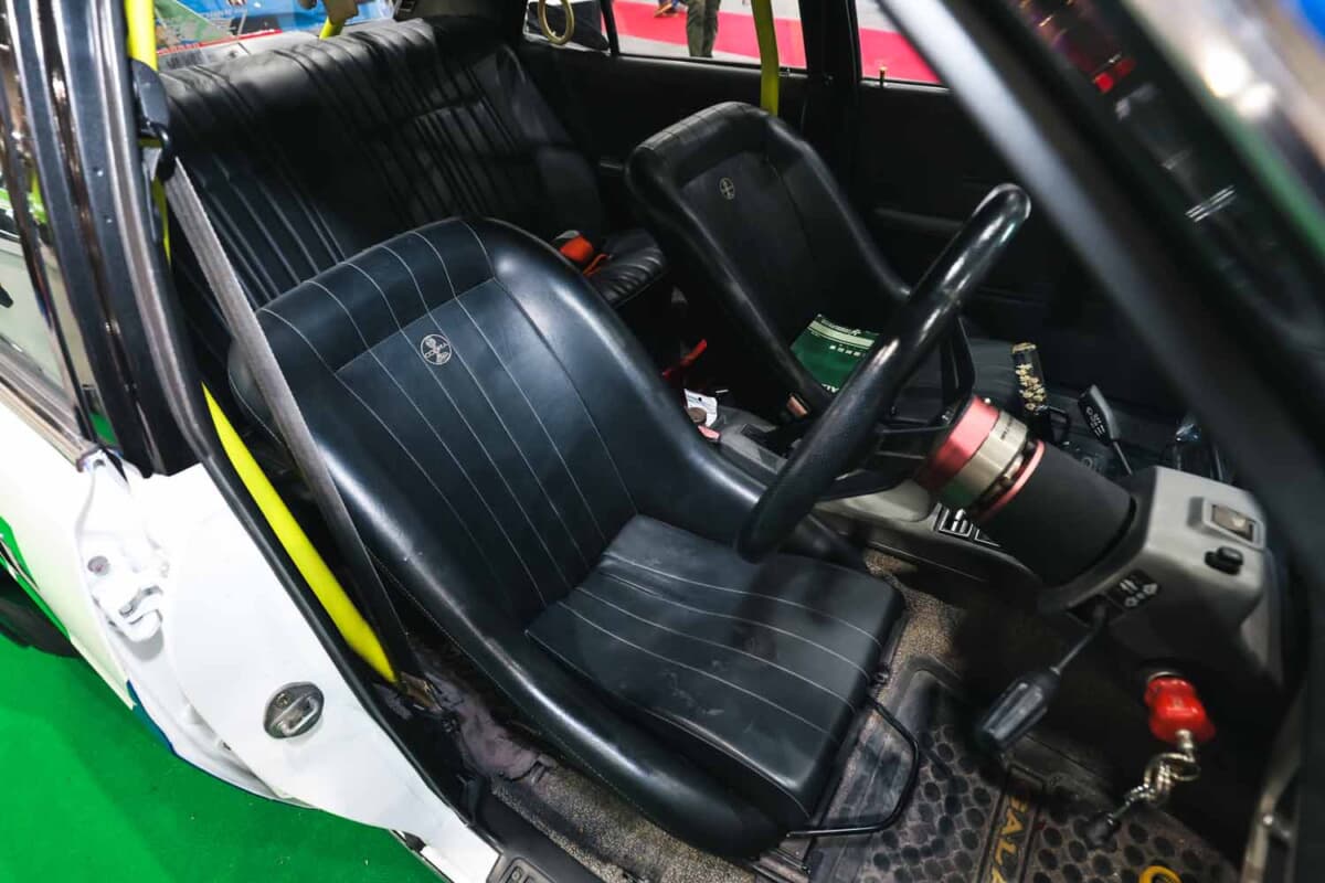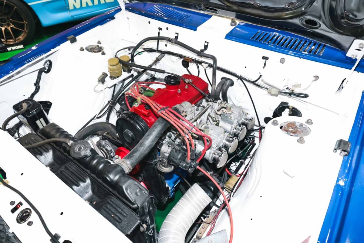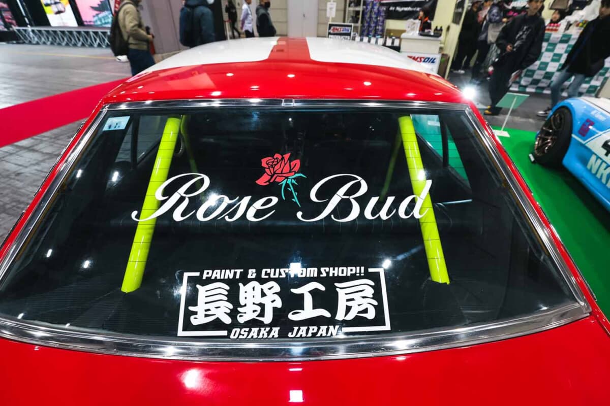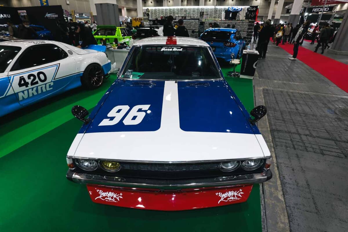 通りかかった人たちが「ジャパンかな」と思った理由は、そのカスタムスタイルが旧車改造のセオリーそのものだったせいもあるだろう。トリコロールカラーにオーバーフェンダー、丸目4灯マーシャルライト、荒メッシュグリル、バンパーにチンスポイラーを組み合わせた顔つきは、パッと見てスカイラインジャパンっぽさがある。ただし、ボンネットノーズが4気筒エンジンのためL型6気筒に比べると少し短い点と、ウインカー+コーナーレンズがヘッドライト横に埋め込まれている点が微妙に異なる。その違和感こそが、旧車好きをうならせるポイントになっていたわけだ。