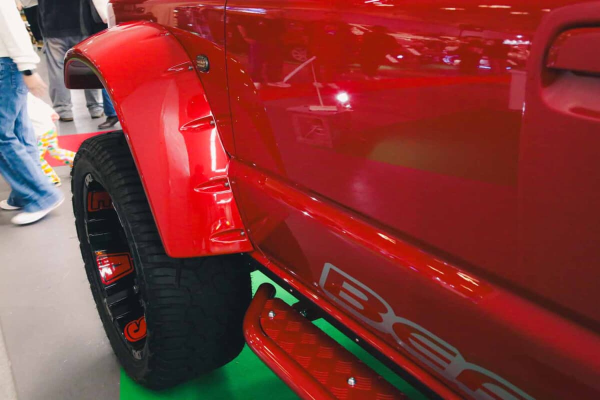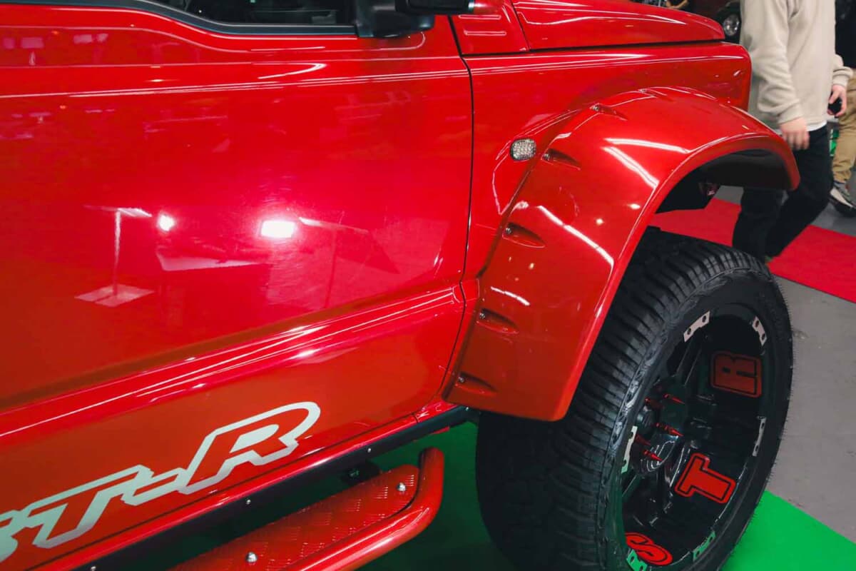 まず強烈なインパクトでギャラリーを魅了していたのが、ビーストRが製作したクラッシュNAスタイルのノマドだ。ワイルドさ全開なエアロフォルムに4.5インチ(約11cm)のリフトアップも刺激的だが、なんと言っても衝撃的なのが片側200mmという突き抜けたクラッシュ・ザ・クラッシュ100オーバーフェンダーの存在感だ。過激さ重視の攻めたノマドを志すなら、このフェンダーはマストアイテムだ。