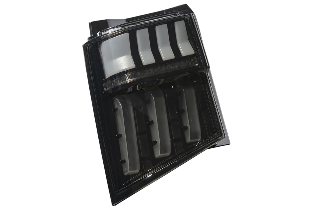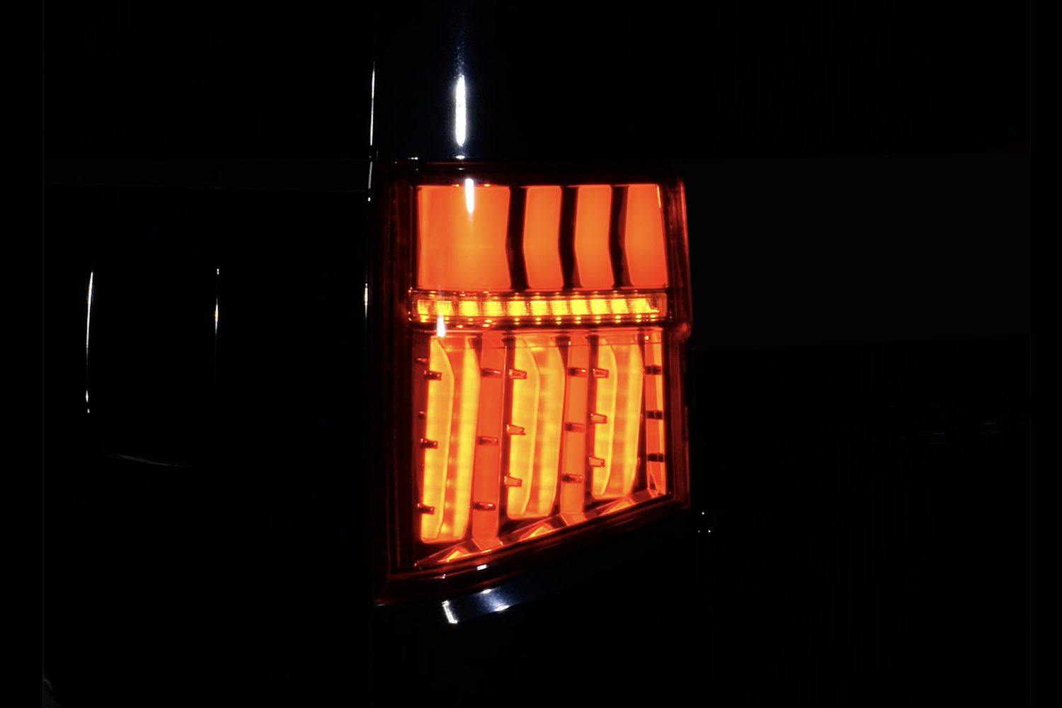 三菱デリカD:5用「ジュエルLEDテールランプURTRA」は、左右合計で110LEDと8LEDバーを採用。LEDバーによるポジションランプ点灯時には、幻想的なリヤビューを演出する。そしてポジション/ブレーキ、ウインカーすべてに高輝度LEDを採用。ブレーキとウインカーはインナーレンズになっているため消灯時もスタイリシュな印象だ。ブレーキ点灯部分をポジション点灯できるブレーキポジションモードを搭載し、点灯パターンを選べるようになっている。