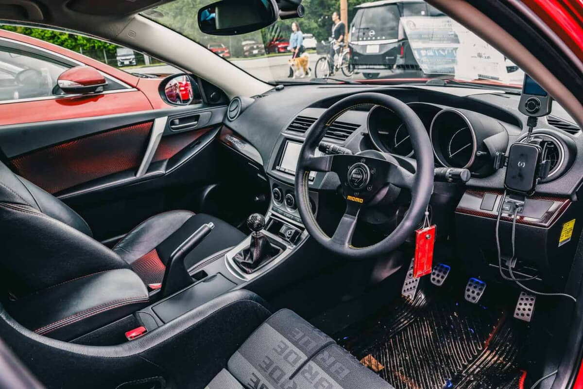 「これが初めてのクルマなんですが、スポーツタイプが欲しいと思っていたので、シビック・タイプRとかインプレッサとかランエボを探していたんです。でも値段が高かったり、乗ってる人も多かったりで、他を探し始めたところ、このクルマが近くの販売店で偶然出てきたんです。全然候補ではなかったんですけど、クルマを見たらすごくスタイルがいいし乗ってる人も見ないからいいなと思って調べたんです。そしたらマツダスピードのアクセラっていうクルマなんだ、って知って購入しました。一目惚れですね」
