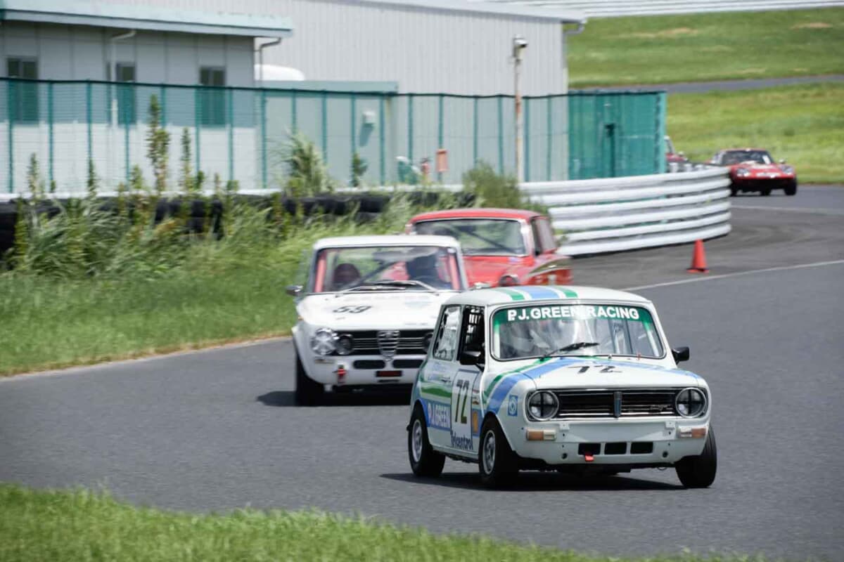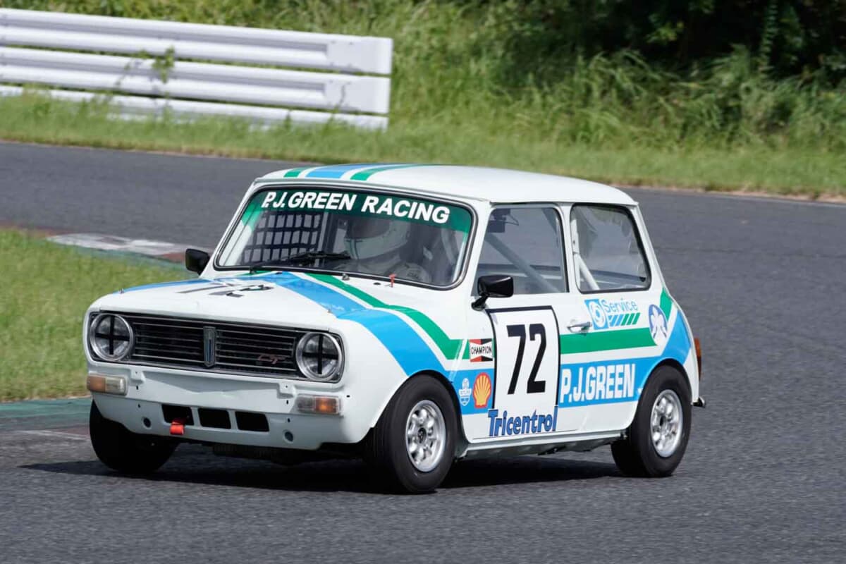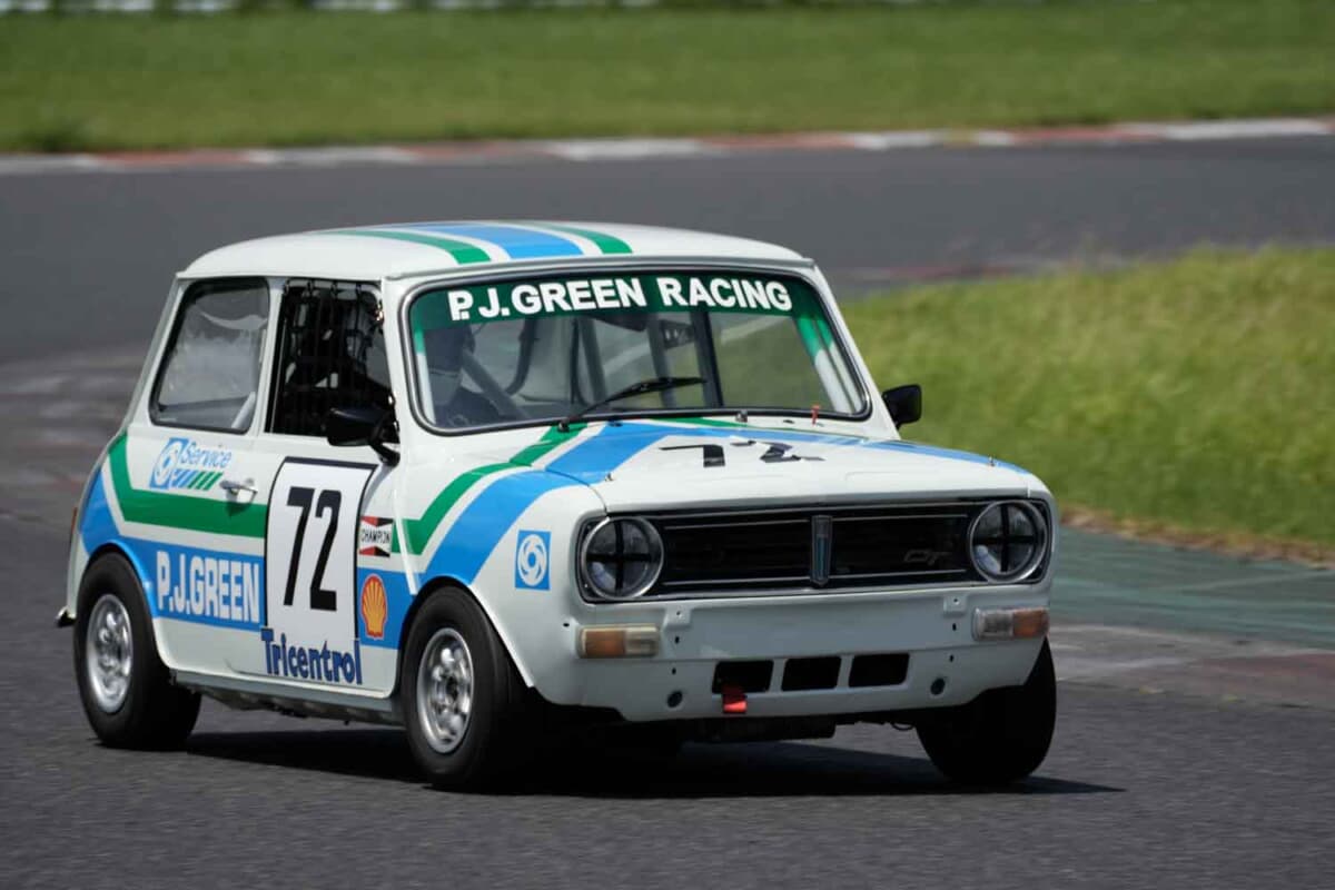 普段のFoSTでは車両年式に合わせたドレスコードを推奨している。しかし今回の4時間耐久レースでは、お揃いチームウェアで楽しもうとマシンのカラーリングに合わせたところ、某コンビニエンスストアのようになってしまったというオチのようだが、じつはこれ、同じミニ クラブマンGTで実在した「P.J.GREEN RACING(1960年~1970年代にブリティッシュ・サルーンカー選手権でミニを走らせ大活躍した強力プライベートチーム)」を模した由緒正しいカラーリングなのである。高い技術力でワークス勢を脅かす「名門プライベーター」チームで、いまだに英国では語り継がれるほど有名だ。
