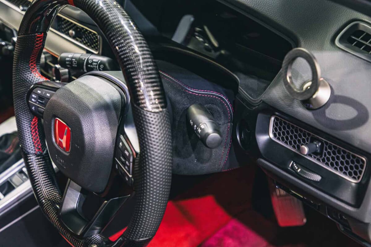 ドレスアップパーツとしては、AlphaRex NOVA LEDプロジェクターヘッドライト&プロテクションフィルム、EastCloudカーボンステアリング、AピラーとステアリングコラムにはEastCloudのレザー&スエード仕様を装着するなど、パフォーマンスアップとドレスアップの両面で充実した仕上がりとなっている。