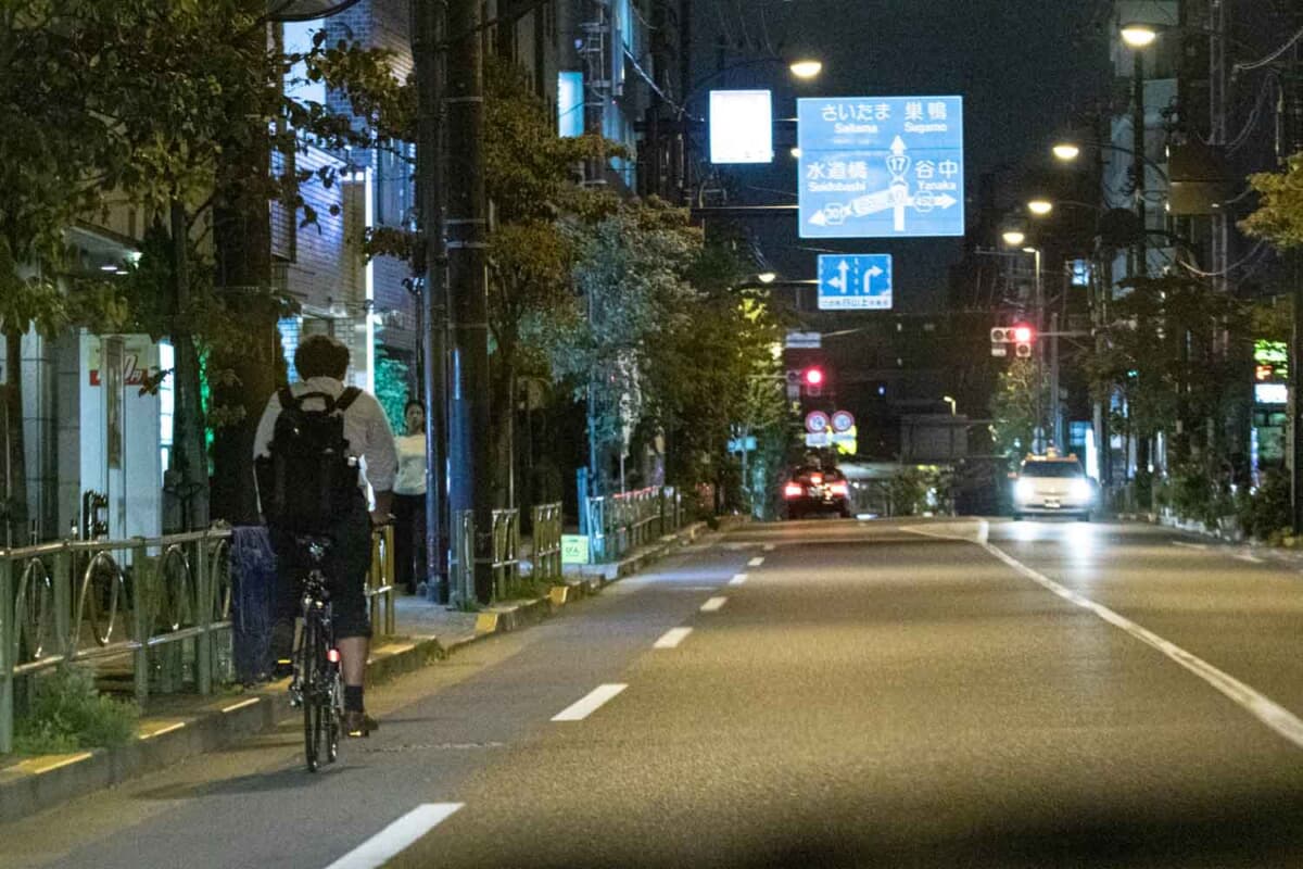 • 夜間、シティサイクルが無灯火で走行。暗闇に紛れ、自らの存在を周囲に知らせる前照灯を点灯させていない。歩行者や他のクルマから見えず、極めて危険な行為だ