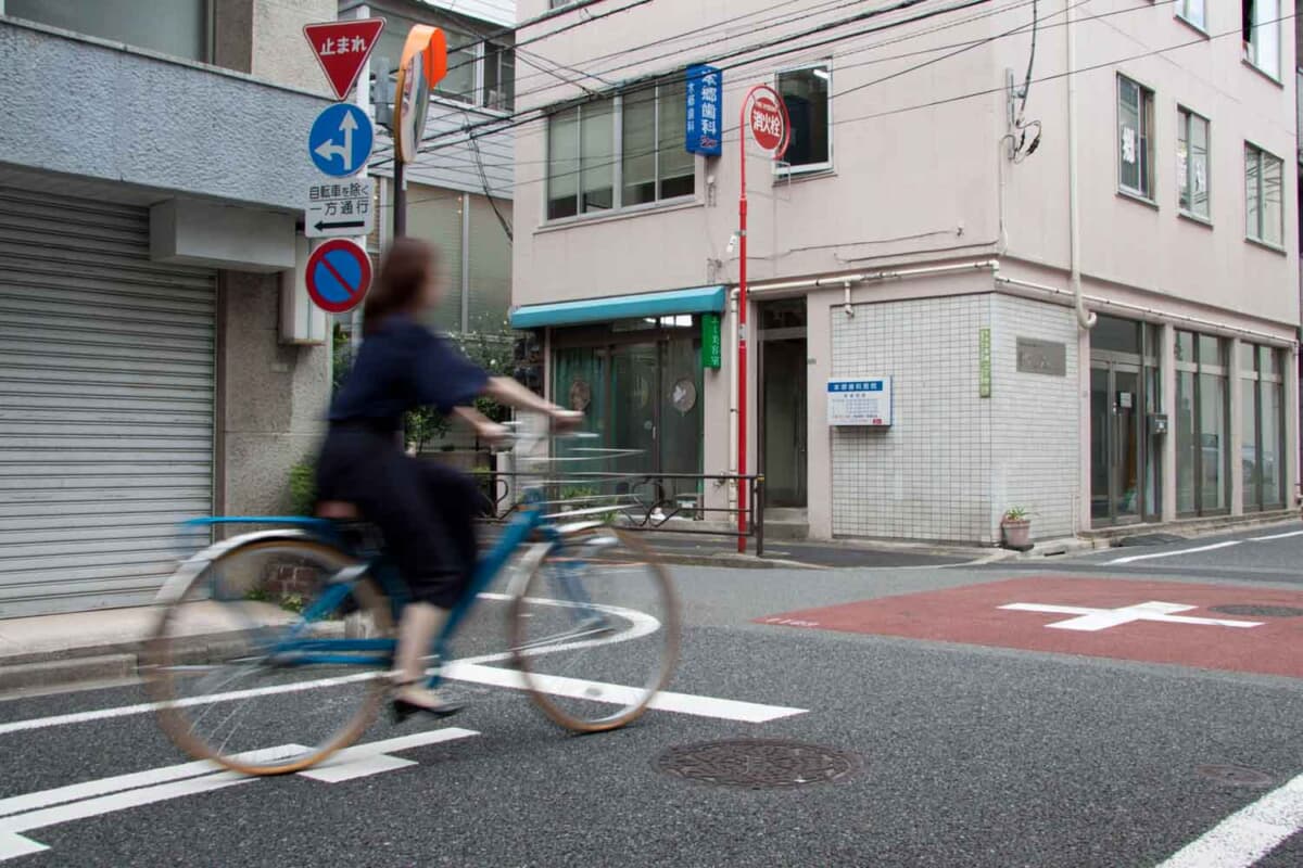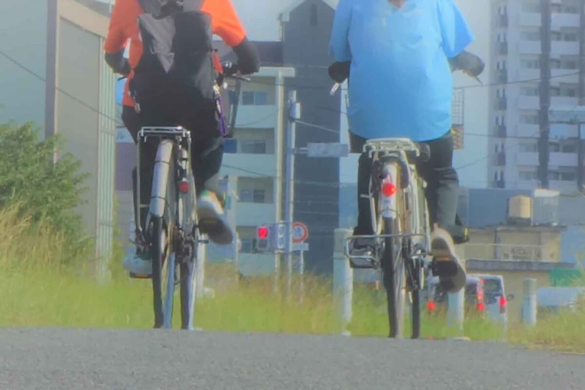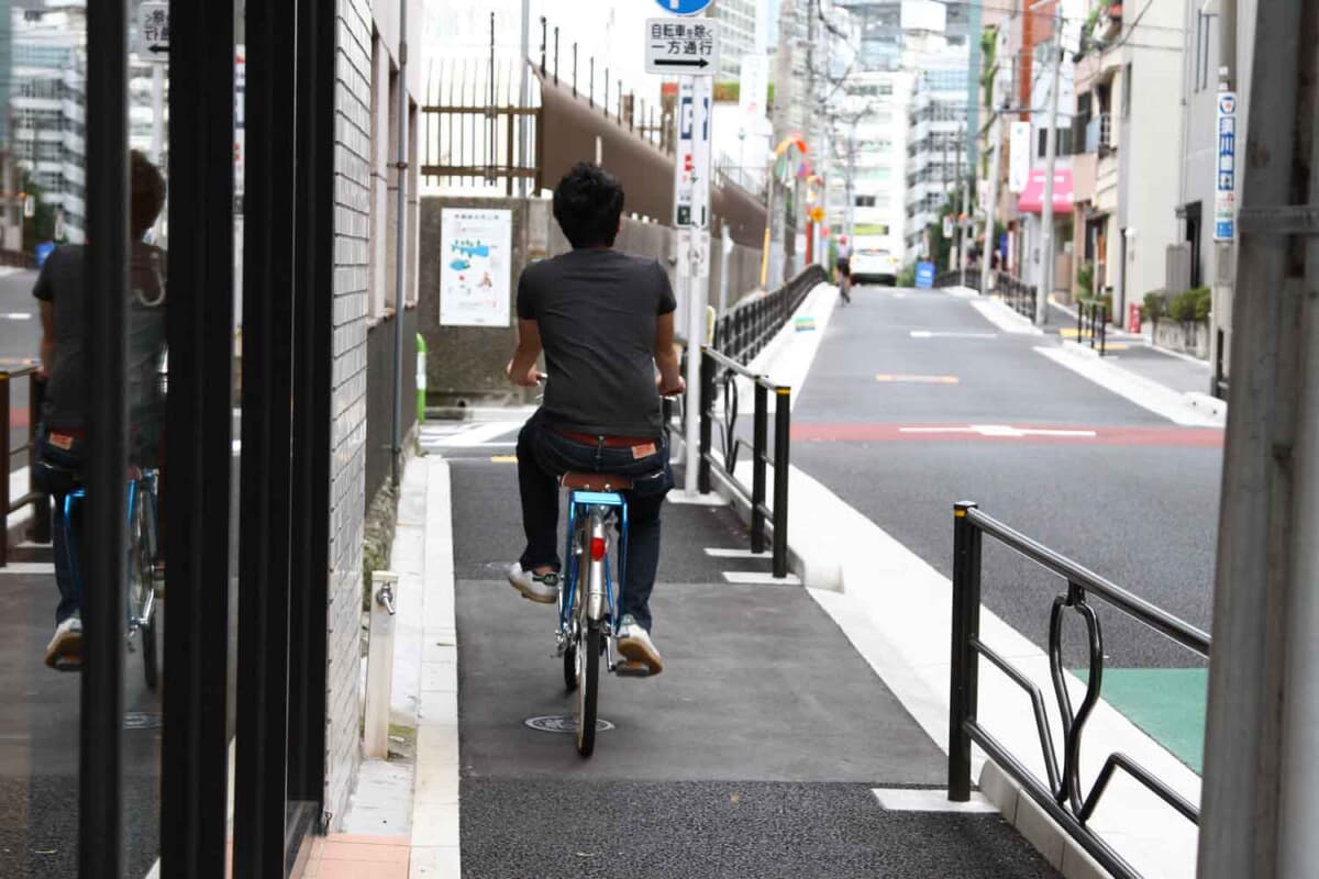 • 車道の左側を通行する自転車。自転車は「軽車両」であり、原則として車道の左側を通行しなければならない。右側通行(逆走)はクルマとの正面衝突の危険が高く、6000円の反則金が科される