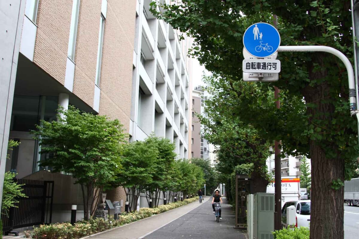 • 「普通自転車歩道通行可」の標識の奥を走る自転車。この標識があれば歩道を通行できるが、歩道の中央から車道寄りを徐行する義務がある。歩行者の横を猛スピードで走り抜けると3000円の反則金対象となる