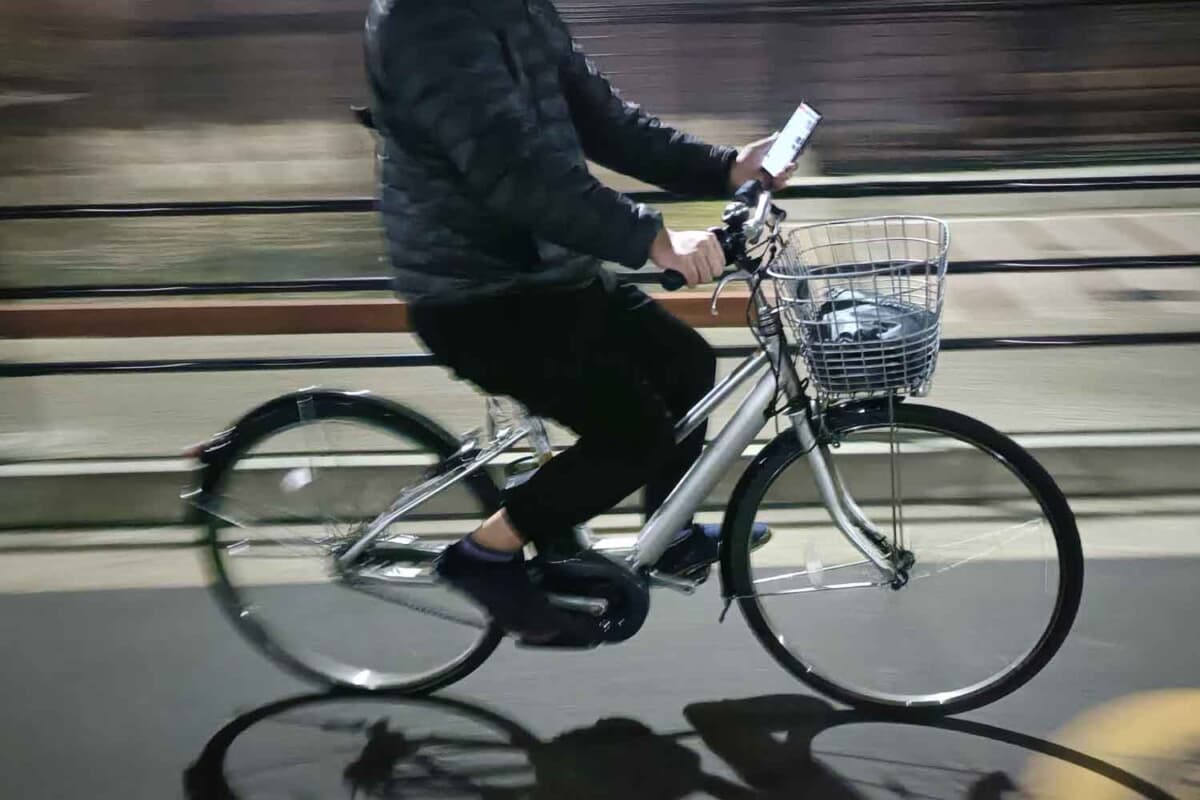 • 夜間、シティサイクルを片手運転しながらスマートフォン操作。画面を見つめる視線は前方から逸れており、重大な事故を招く危険な行為だ。速やかにやめるべきである