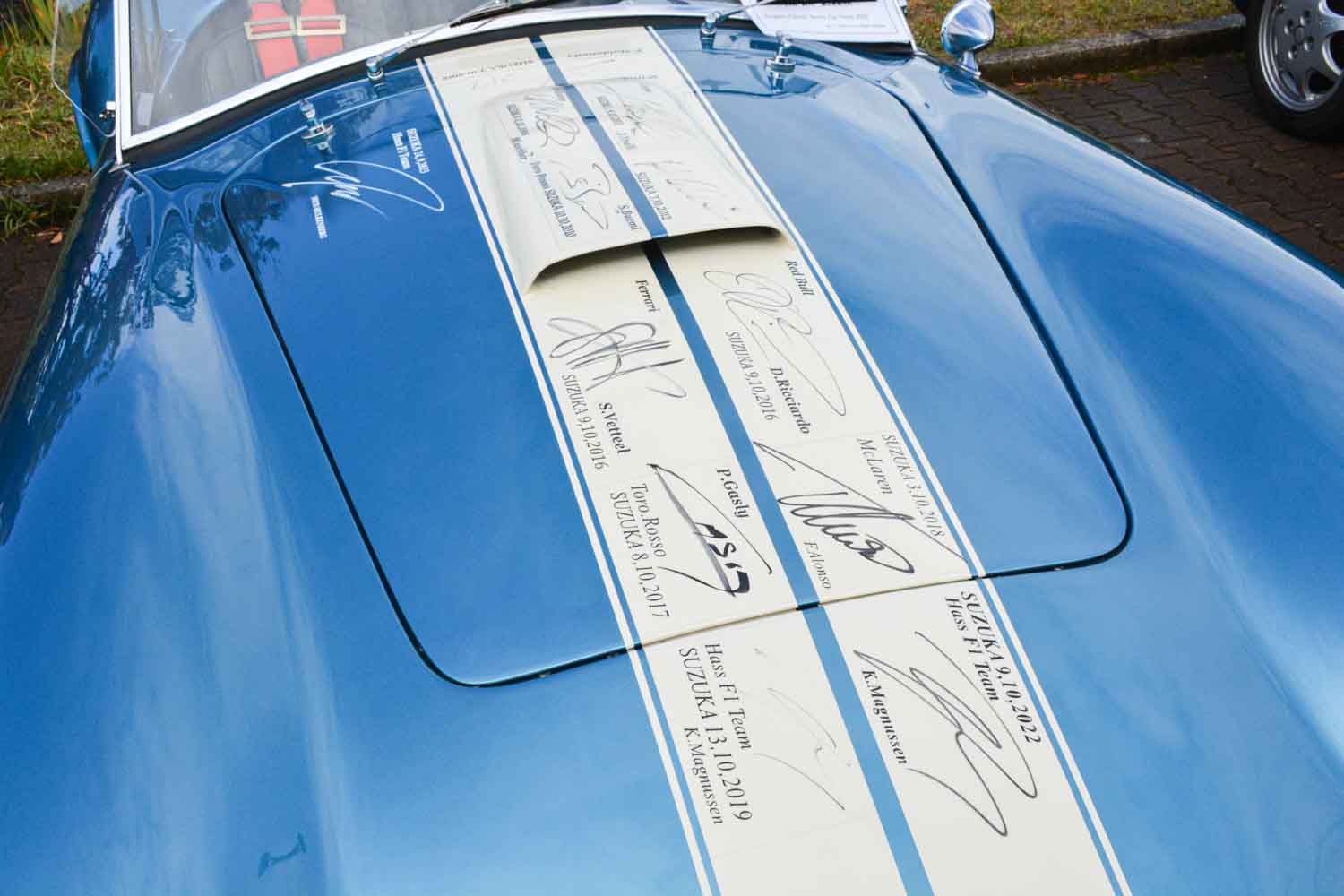 Oさんは毎年F1ドライバーを助手席に乗せてパレードをするたび、その記念にクルマのボンネットへサインを書いてもらってきた。