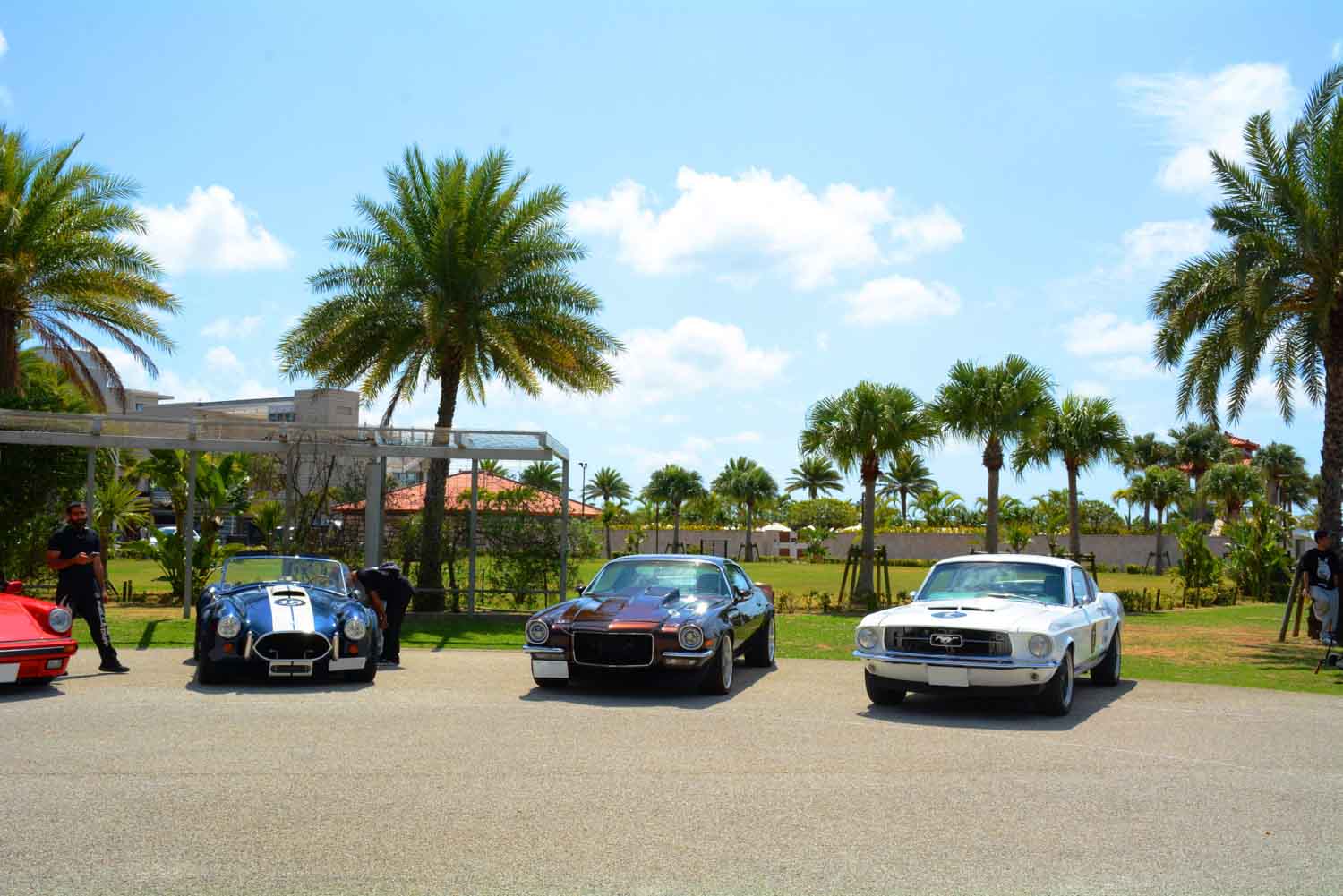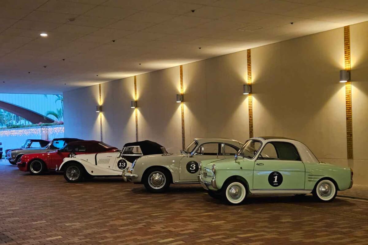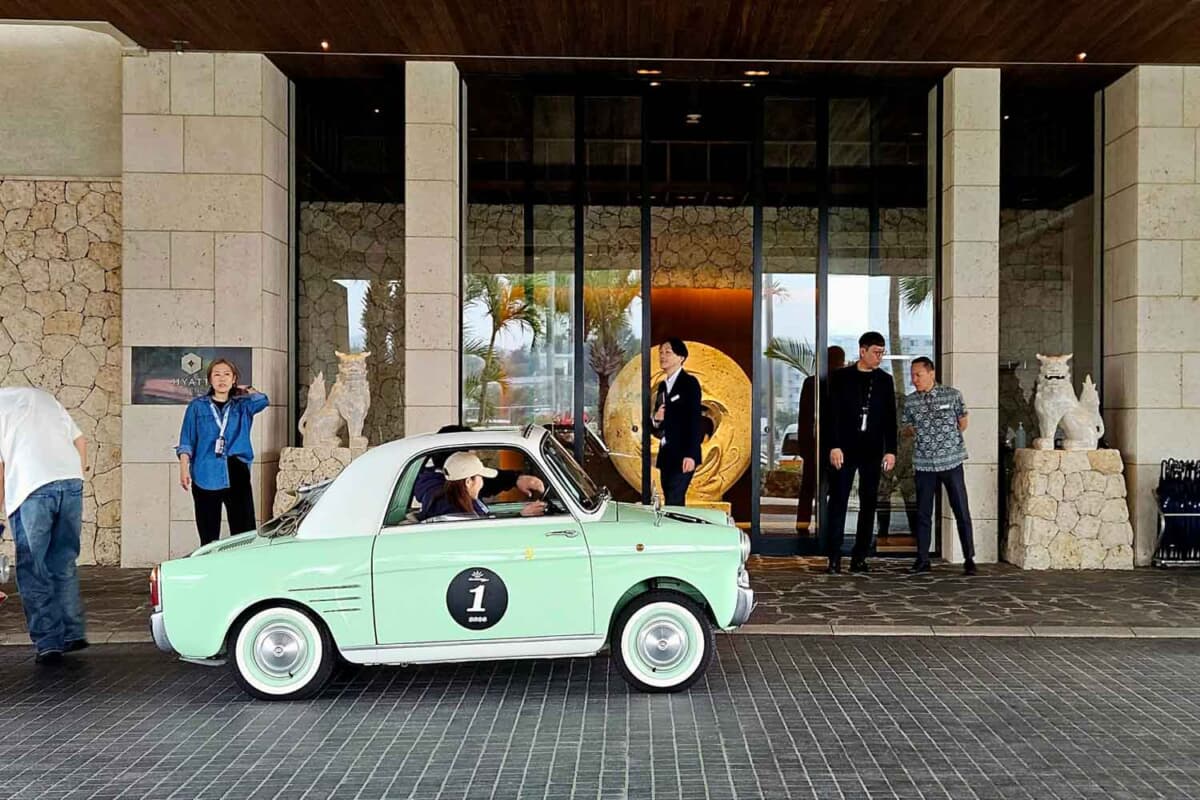 大会初日の朝、本島中部の恩納村にあるリゾートホテル「ハイアットリージェンシー瀬良垣アイランド沖縄」にエントリー車両が集結した。参加者(エントラント)の多くを占める首都圏や東海・関西圏の在住者にとって、沖縄は少々遠方ということもあってか、ゲスト参加組を含めて総計16台とやや少なめであった。しかしながら、集まった車両のユニークさは、ほかのクラシックカーラリーではなかなか見られない壮観なものだった。
