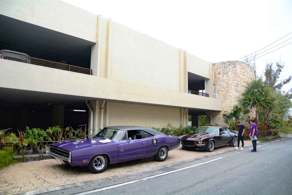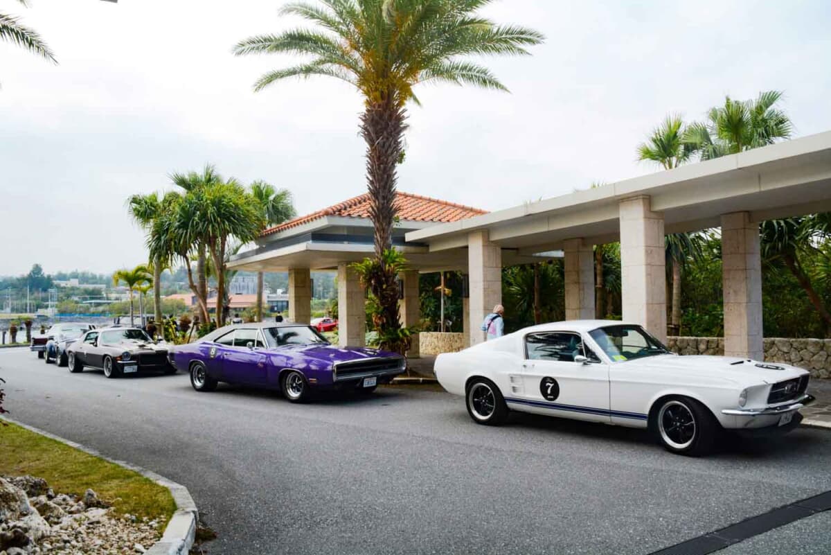 • 「ハイアットリージェンシー瀬良垣アイランド沖縄」にて仮スタートの順番を待つ、フォード マスタング ファストバックとダッジ チャージャーの力強い2台だ