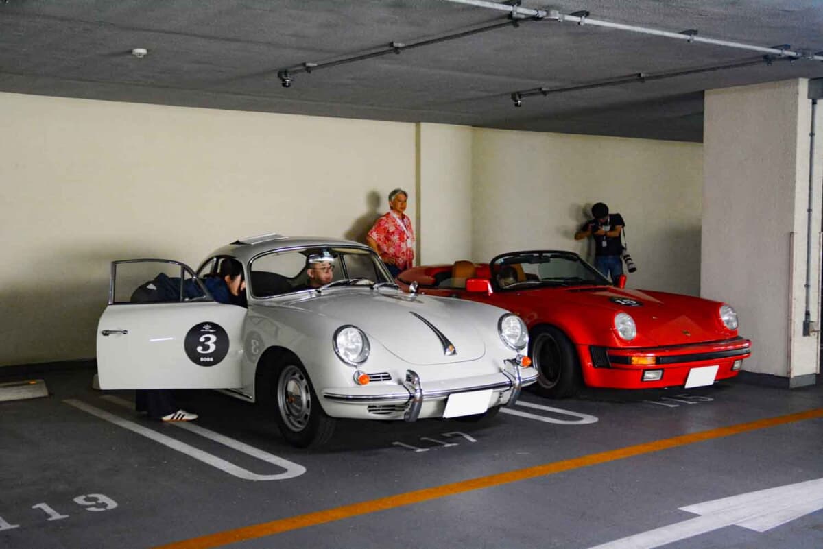 • スタート準備をするポルシェとそのエントラントたち。左は父娘ペアが乗る「356SC」で、右は夫婦ペアのエントリーとなる「911カレラ3.2スピードスター」である