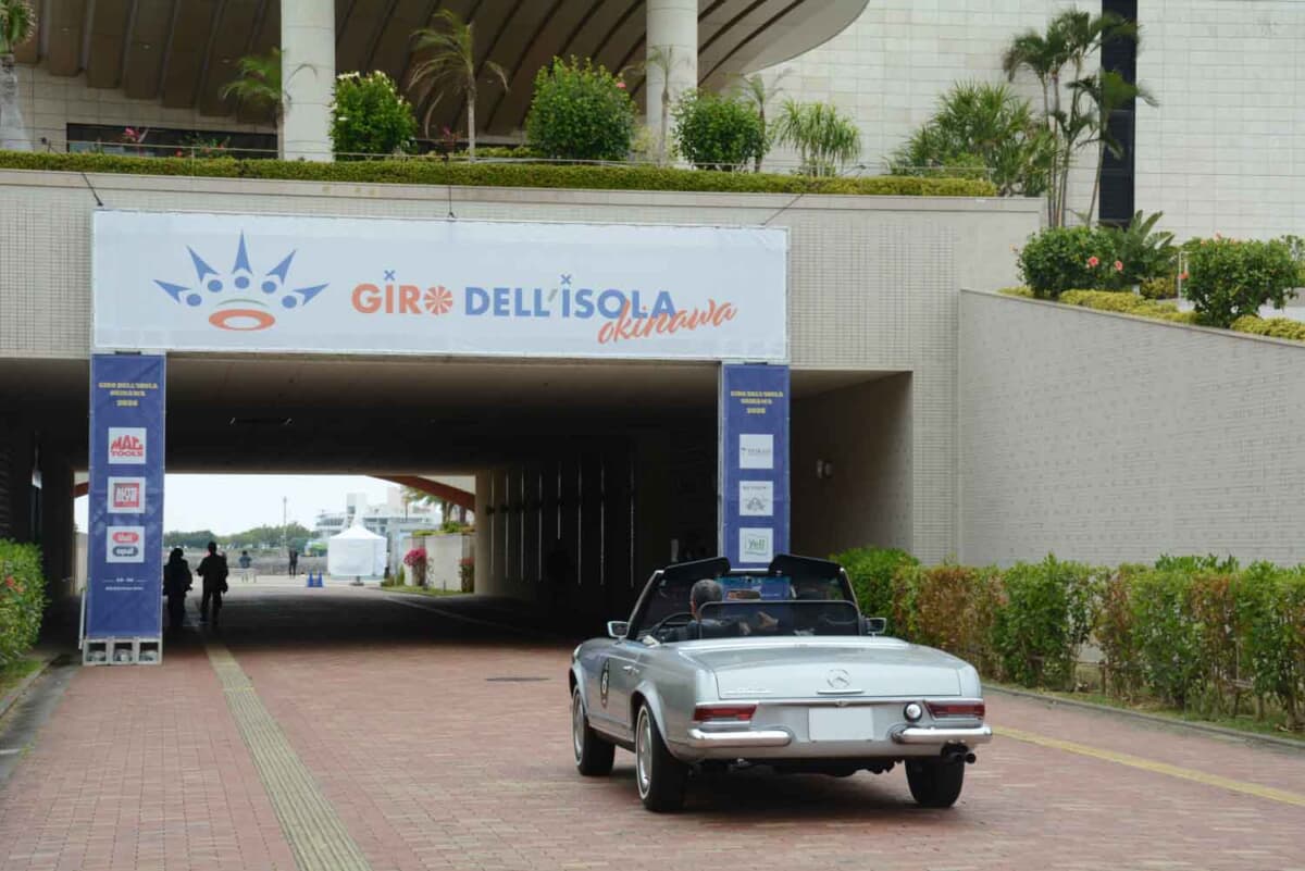 • 初日、スタートセレモニーが行われる「北谷フィッシャリーナ中央広場」へと無事に到着した、1968年式メルセデス・ベンツ 280SLの優雅な姿である