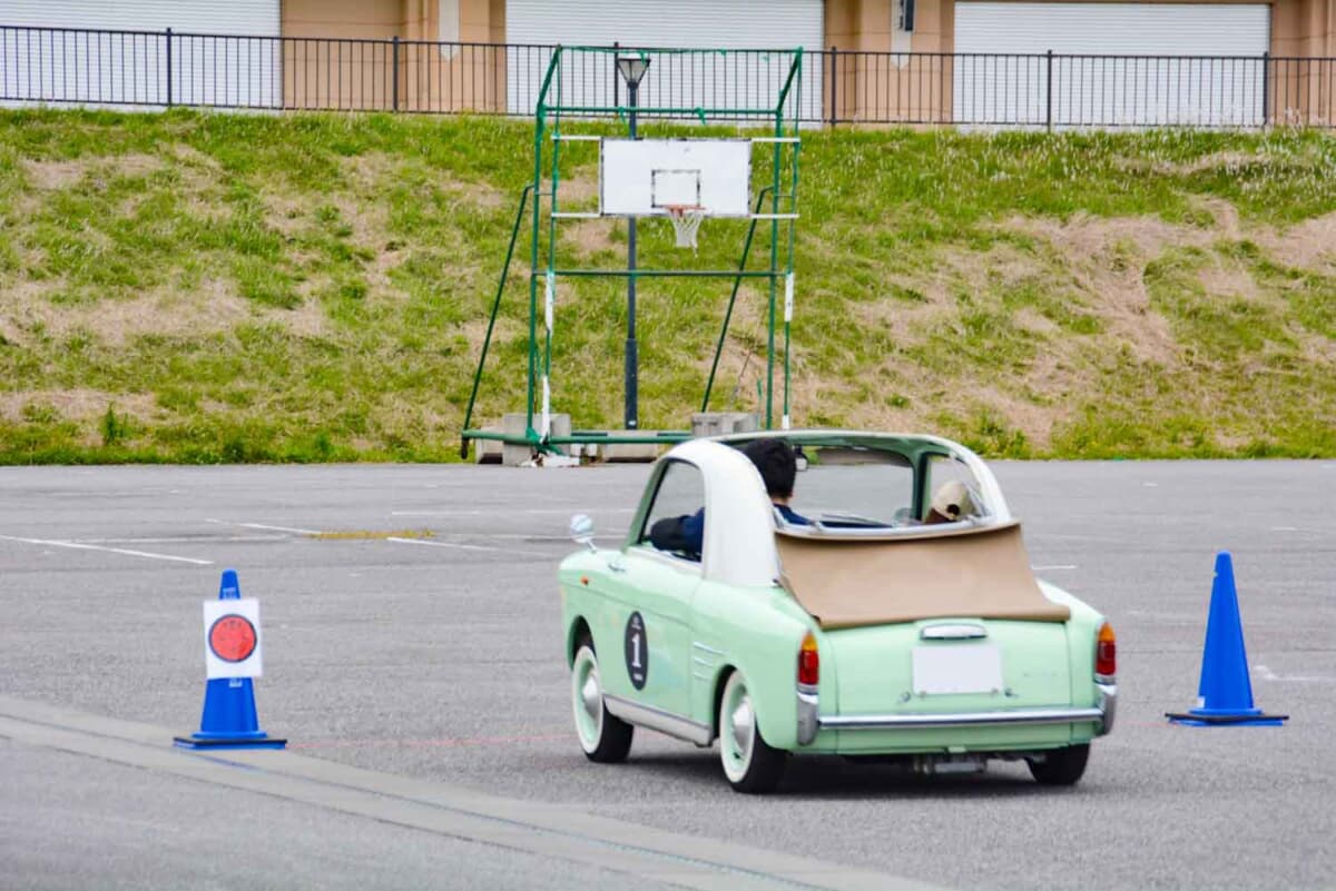 • 2日目、「赤間総合運動公園」にて行われたP.C.競技で奮闘する、1960年式アウトビアンキ ビアンキーナ トラスフォルマービレに乗る夫婦ペアである