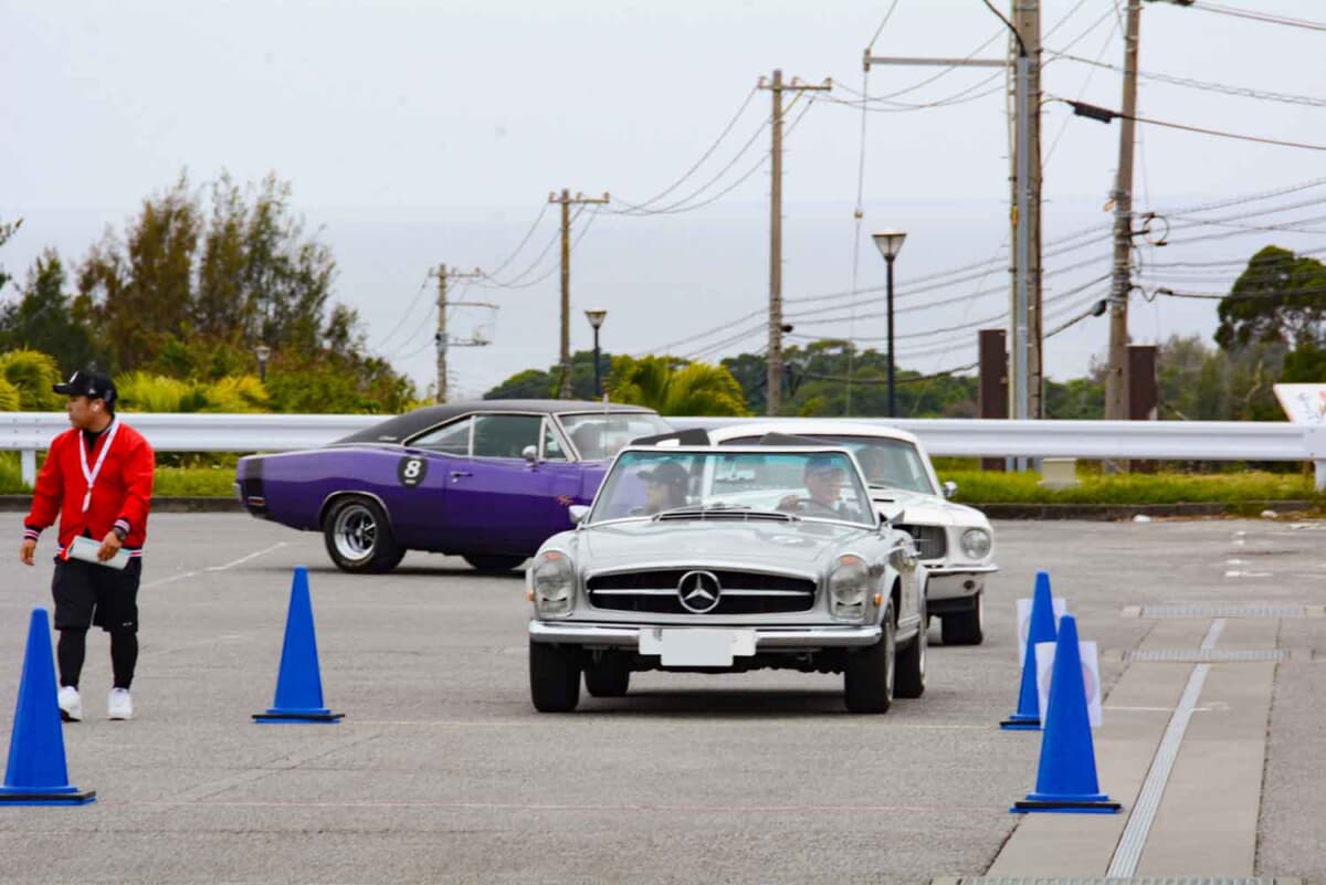 • 2日目、「赤間総合運動公園」にて行われたP.C.競技に臨むエントリー車両たち。車列の先頭を飾るのは1968年式メルセデス・ベンツ 280SLである