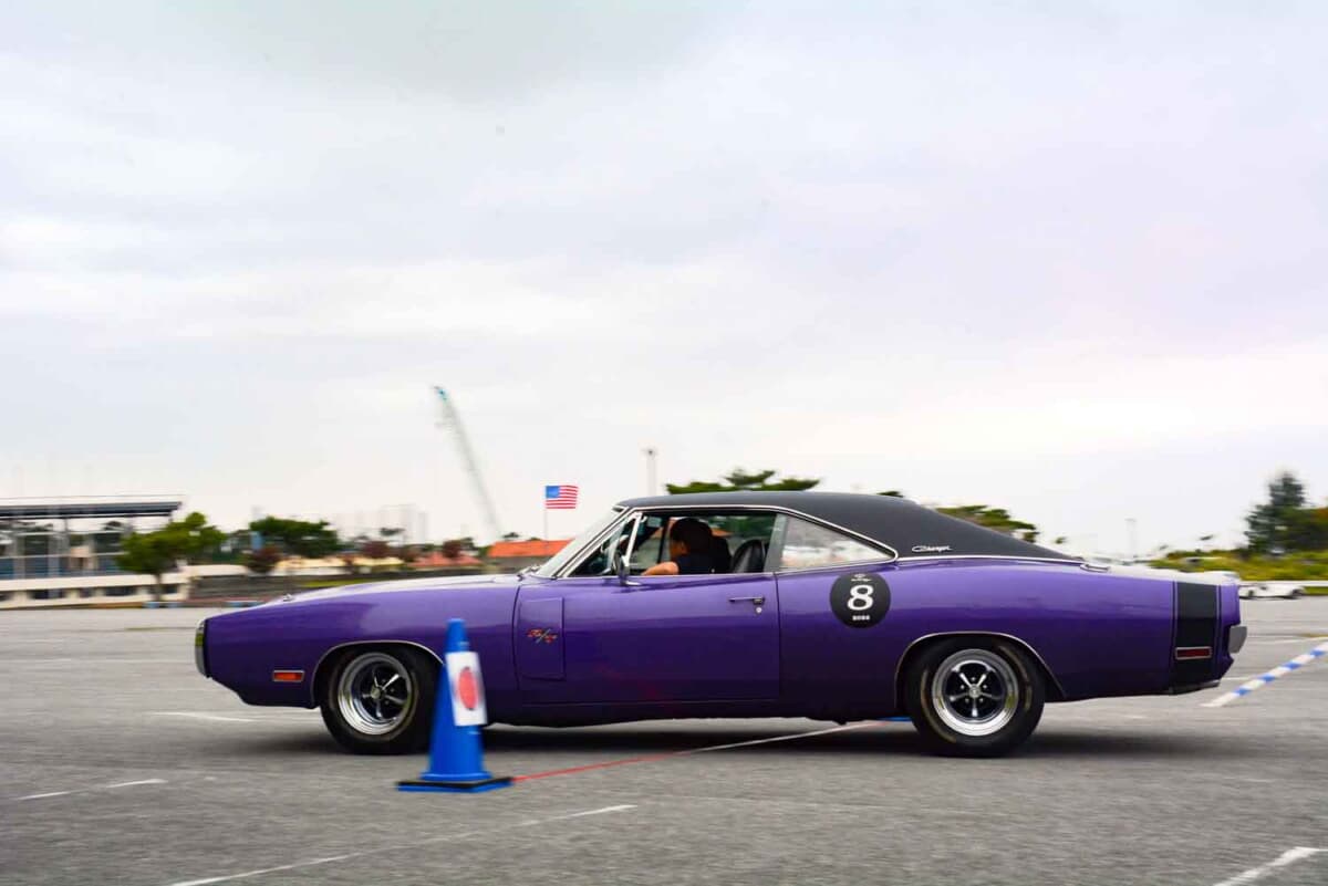 • 2日目のP.C.競技で奮闘する1970年式ダッジ チャージャー。第1回からの常連ドライバーによるさすがの腕前で、巨体を巧みに操る姿が非常に印象的だった