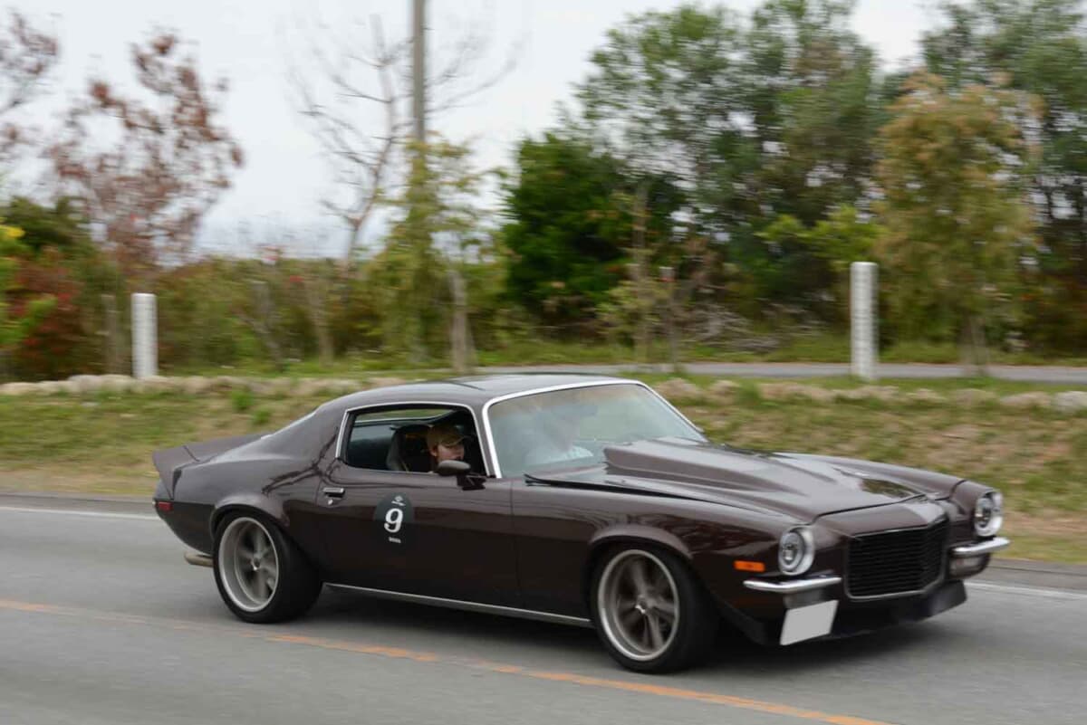 • 2日目、「赤間総合運動公園」でのP.C.競技を無事に終え、次なるチェックポイントに向けて力強く出発していく1971年式シボレー カマロである