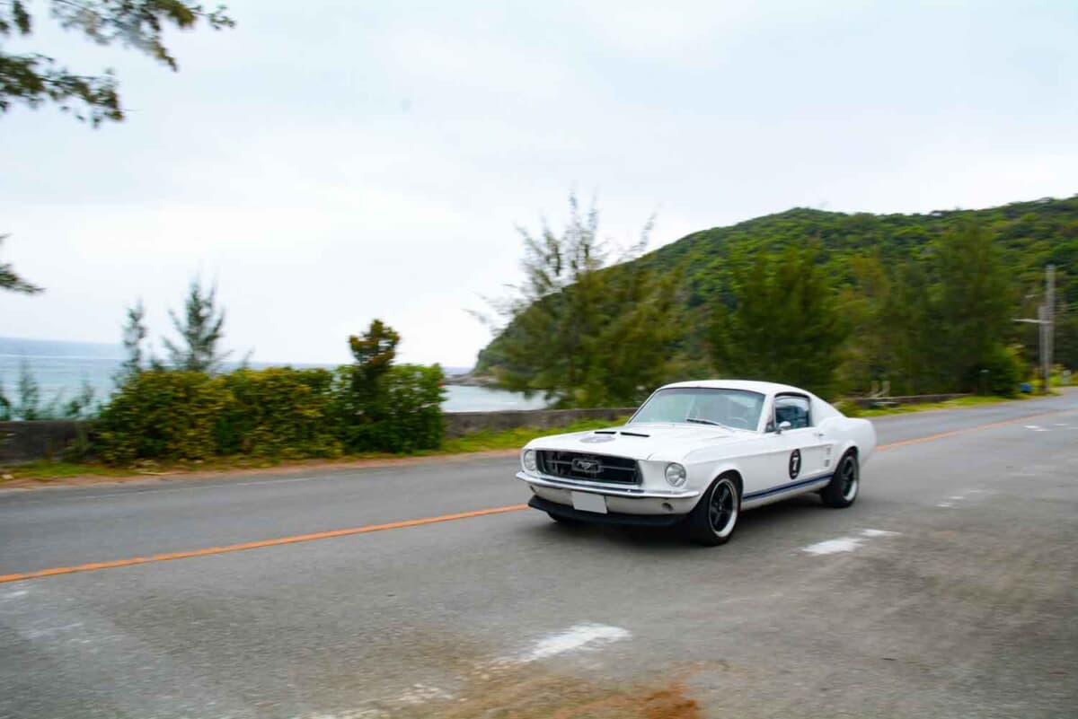 • 国道58号線のシーサイドコースを快走する1967年式フォード マスタング ファストバック。2日目は時おり雨に見舞われたが、天候をものともせず心地よいV8サウンドを轟かせていた