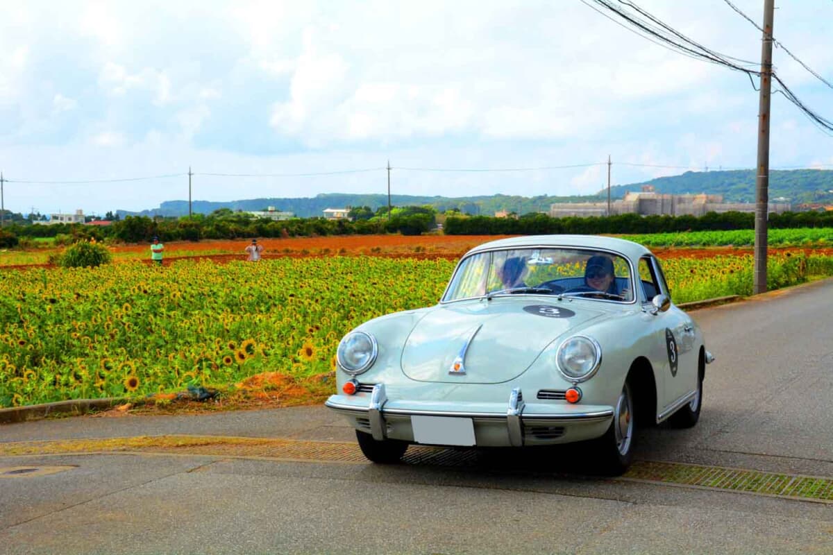 • 晴天に恵まれた最終日、昨今ちまたで話題の「伊計島フラワーロード」のひまわり畑に見守られつつ、カートによるユニークな最終P.C.競技ポイントへと向かう1964年式ポルシェ 356SCの父娘コンビだ
