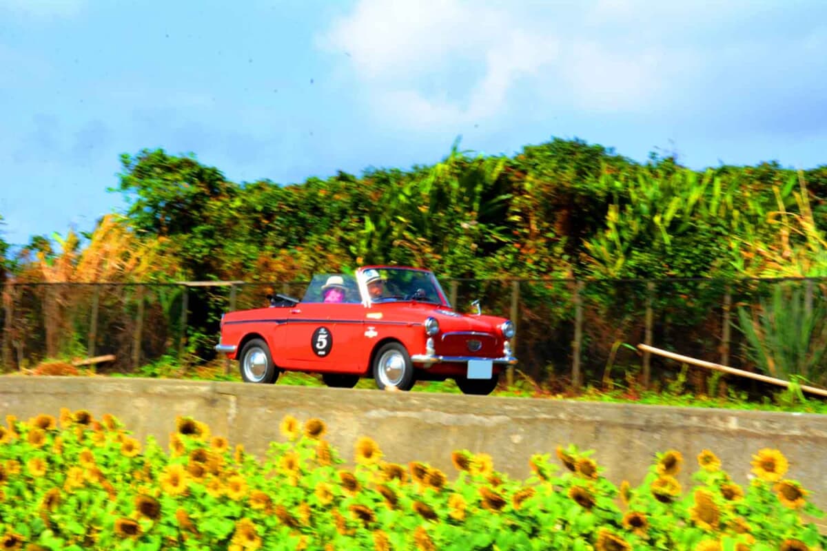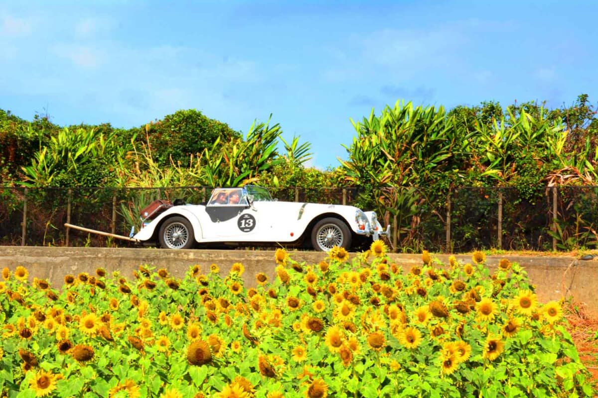 • 晴天に恵まれた最終日、昨今ちまたで話題の「伊計島フラワーロード」のひまわり畑に見守られつつ、カートによるユニークな最終P.C.競技ポイントへと向かう1980年式モーガン +8と若夫婦ペアである
