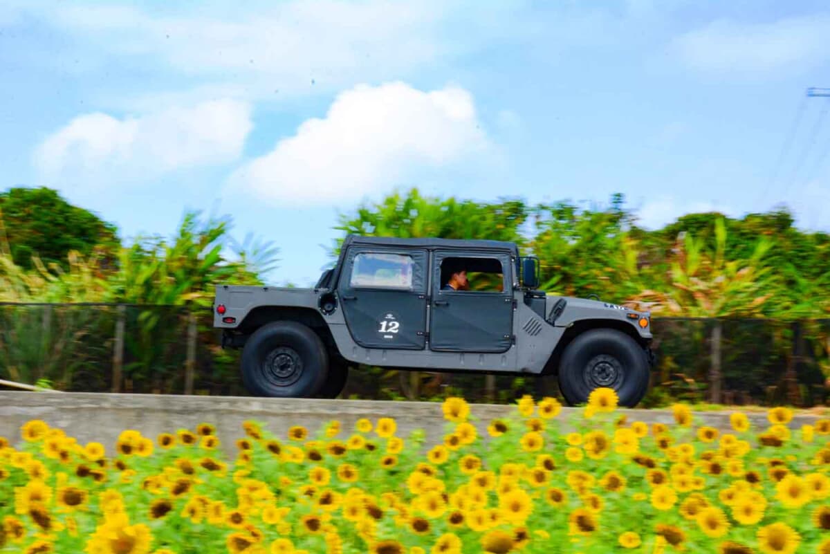• 晴天に恵まれた最終日、昨今ちまたで話題の「伊計島フラワーロード」のひまわり畑に見守られつつ、カートによるユニークな最終P.C.競技ポイントへと向かう1985年式ハンヴィである