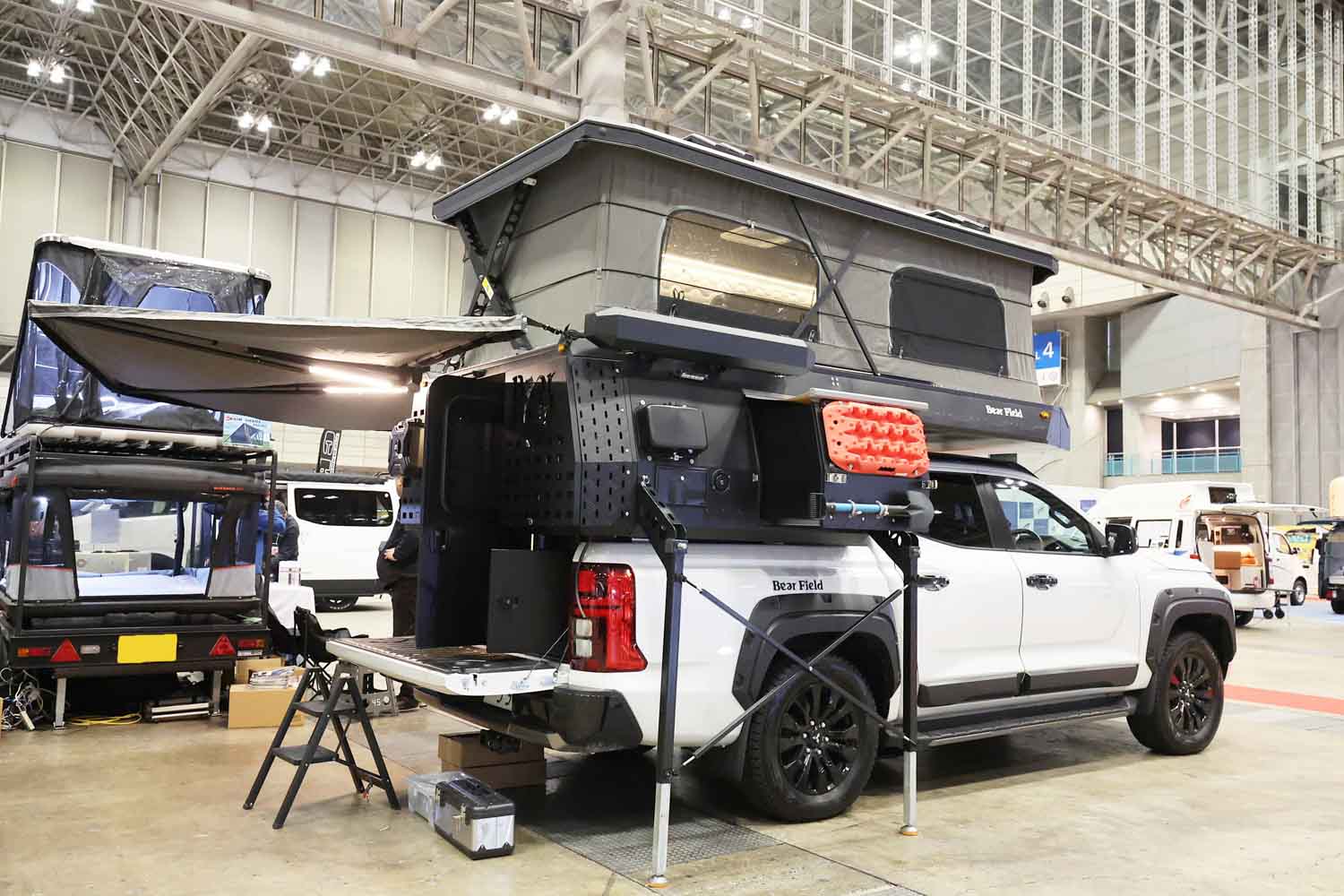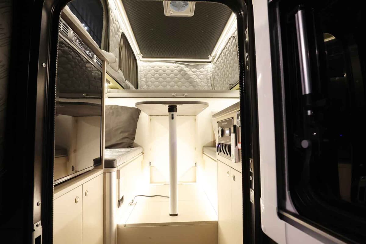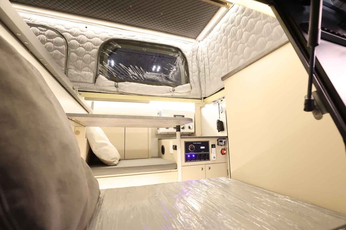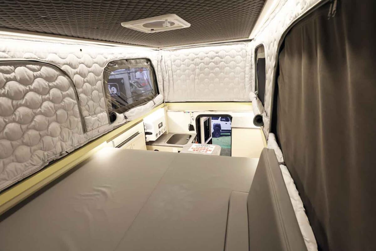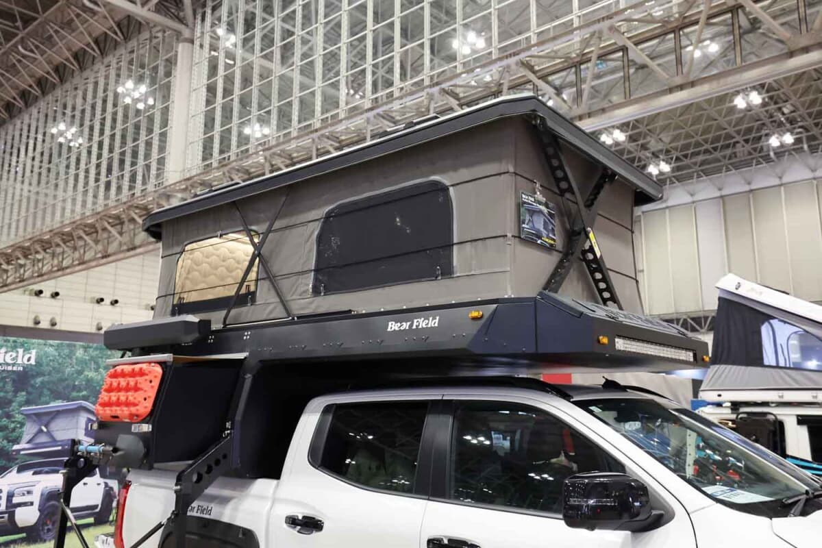 室内は4名就寝の設計になっている。ルーフはスタイリッシュかつ走行時の安定性を考えたポップアップテントスタイルで、収納時はエッジが効いたシャープでカッコいいスタイルとなる。いざポップアップルーフテントを開くと、大人が立って移動できるほどの巨大な空間が出現する。ルーフ前方には長尺物の収納庫もあるので、アウトドアシーンを盛り上げてくれる釣り竿なども入れることが可能だ。また、このポップアップルーフはオプションで電動開閉できるアップグレードパッケージも用意されていた。