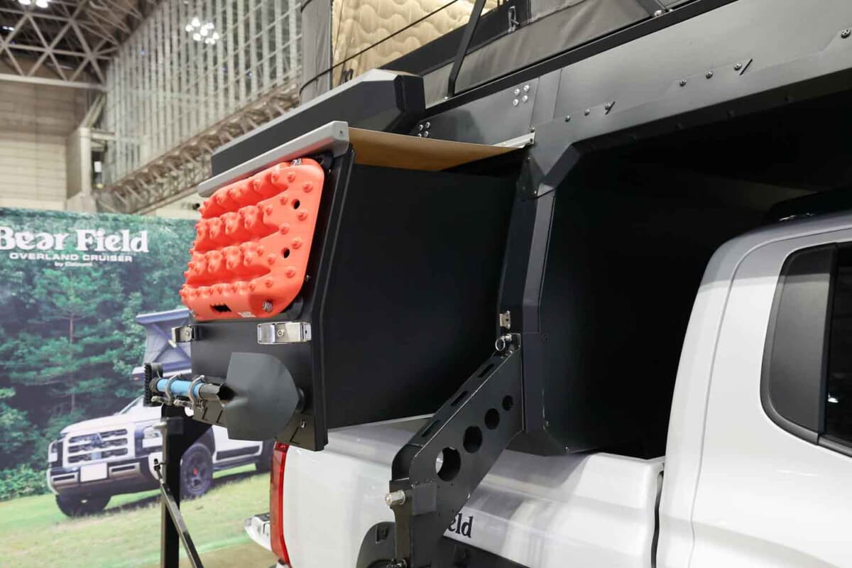 このアウトランドクルーザーは、アウトドアマンを魅了する装備もぬかりなく、便利に使える架装機能として270度のオーニングやLED照明、各種収納庫が豊富に備わる。さらに、システムアップが楽しめるように給水タンクやスコップなどのアイテムをマウントできるギミックな作り込みもポイントと言えるだろう。