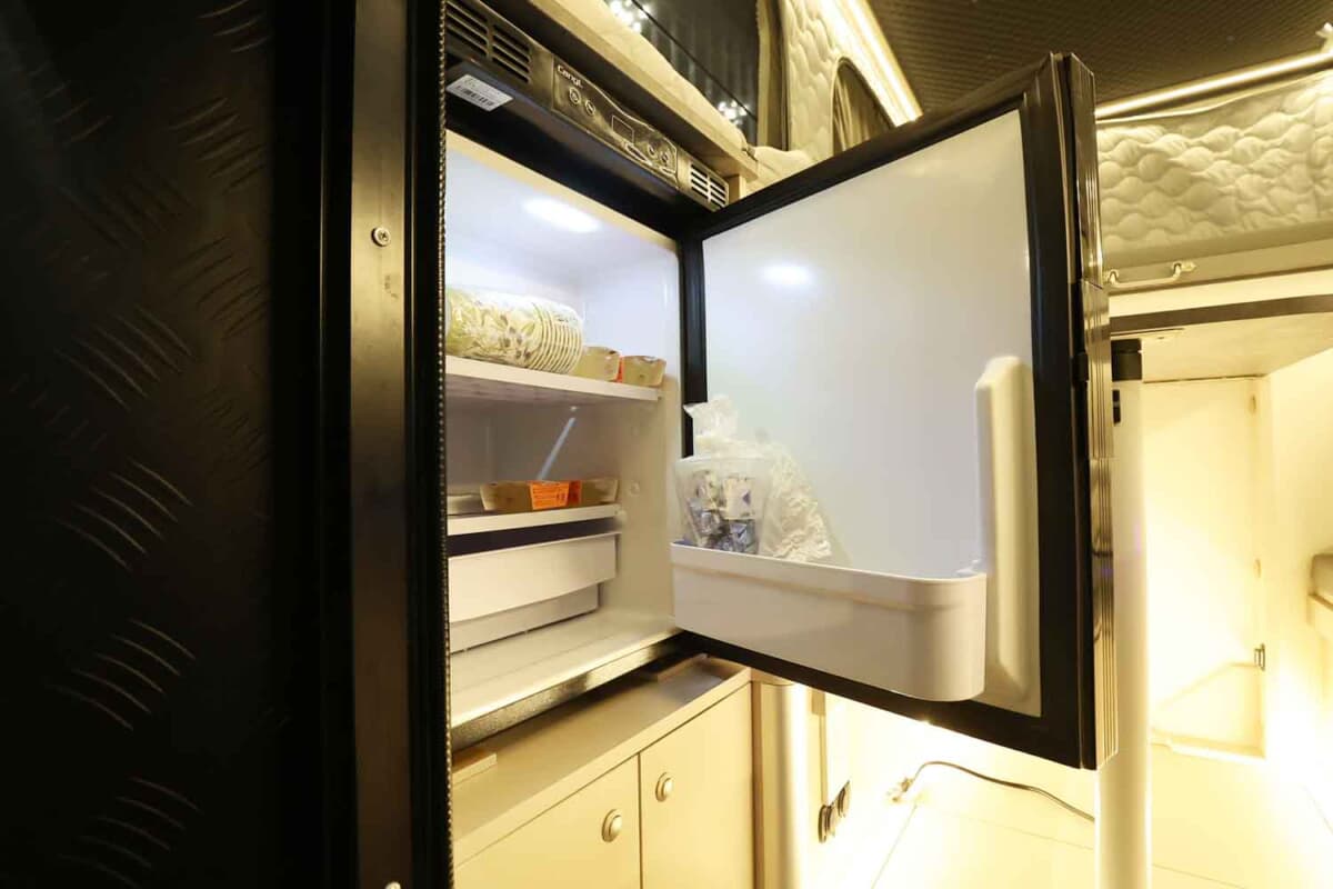 また、入り口左右には冷蔵庫とエアコン、シンクもセットされ、電子レンジなどを置ける台も設置されている。電源は家庭用100V電源で、供給は600Wリチウムイオンサブバッテリーと、ソーラーパネル+走行充電システムを搭載している。