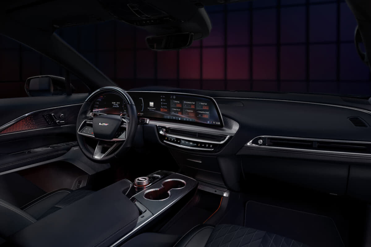 インテリアはキャデラックの伝統であるラグジュアリー性と先進性を兼ね備え、33インチの大型LEDディスプレイを採用。キャデラック「Vシリーズ」専用の表示インターフェースで走行情報を直感的に把握できる。シートには“V”ロゴ入りのパーフォレーテッド・ナッパレザーを使用し、快適性にも配慮したベンチレーション機能を備える。ステアリングには専用バッジやVモードボタンを配置し、特別感を演出している。
