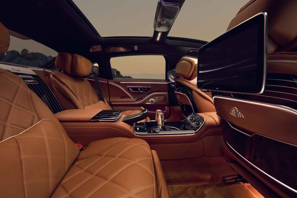 快適装備も一層充実している。自動開閉ドアにより乗降はより優雅な体験となり、後席にはエグゼクティブシートや10L容量の冷蔵庫、銀メッキのシャンパングラスが備えられる。