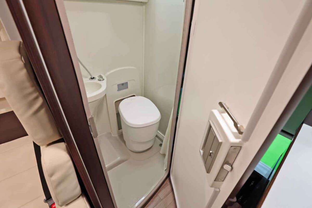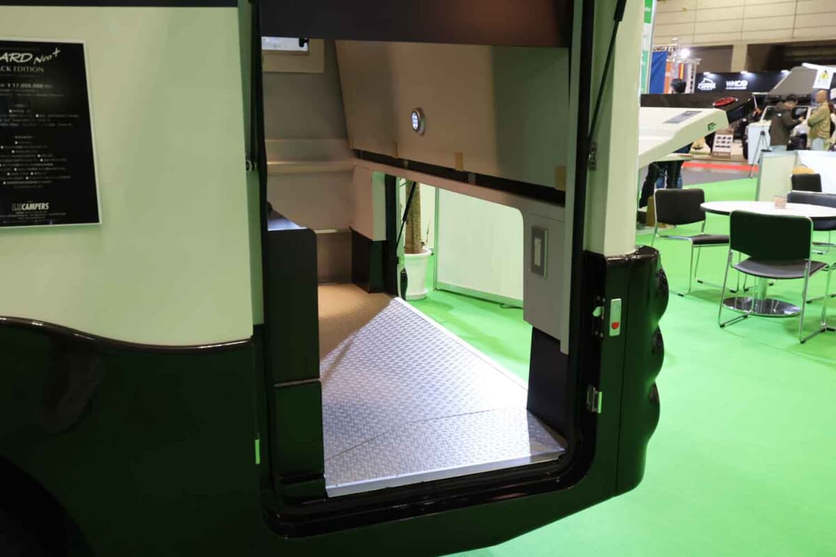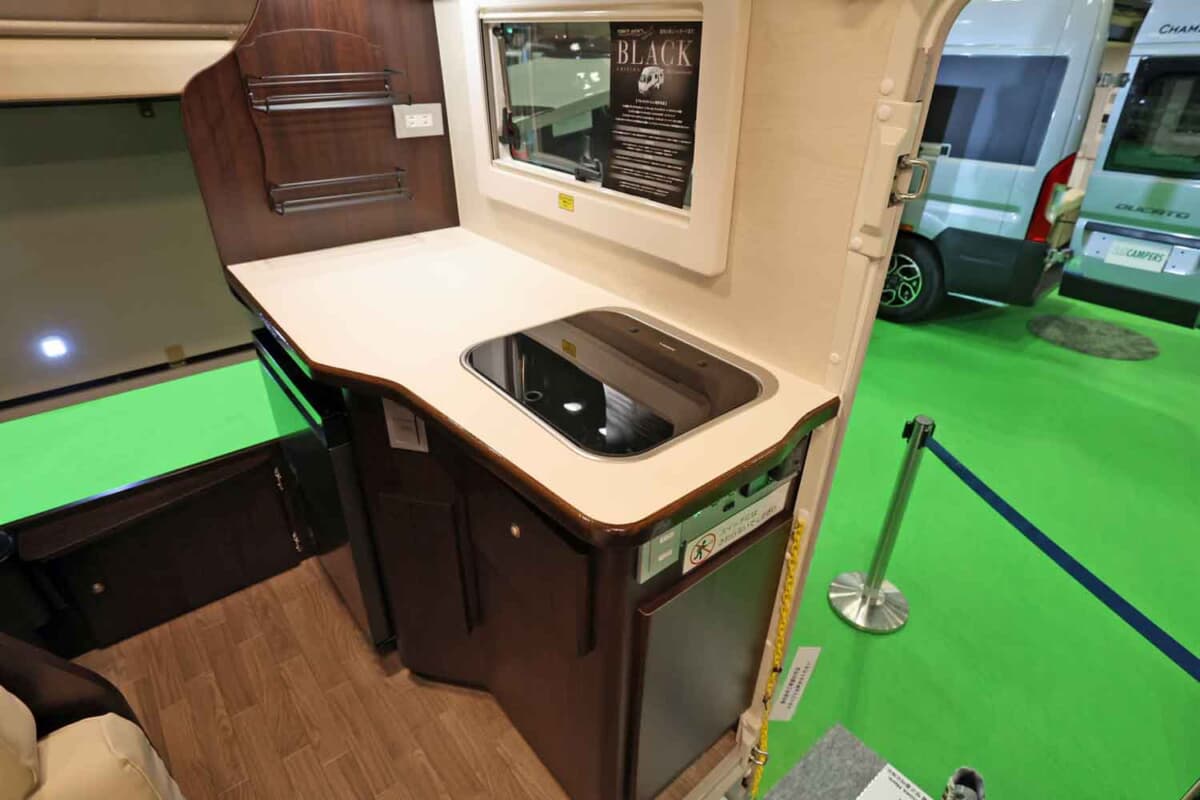 さらに、パイオニア製8インチサイバーナビ、ETC2.0、360Wソーラーパネル、24インチスマートTVを搭載。足まわりには「LTコンフォートサス」と「カムロード・Wソーラーパネル専用強化スタビライザー」を装備する。くわえて、高地対応の多様なモードを選択できるオートタームヒーター、75LのDC冷蔵庫、温冷一体型蛇口も標準装備となっている。なお、展示車には33万円のオプションである人気のラップ式トイレ(クレサナ)も装着されていた。