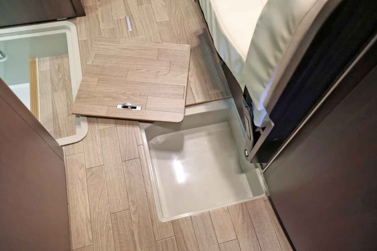 ただし、居住空間のことだけを考えて設計しているわけではない。走行面での重量配分を考慮し、後軸に重心が集中しがちなレイアウトを見直している。そのこだわりは、給水タンクの水が排水タンクに移動しても、重心移動を最小限に抑えて走行安定性を確保する点にまで及ぶ。