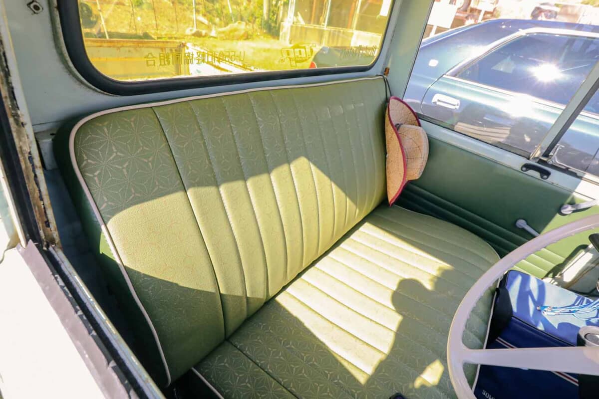 このスズライトキャリイは、基本的にはオリジナルを保ちつつ、一部に当時の雰囲気を残しながらシートやダッシュボード、ステアリングやフロアなどをリフレッシュした。しかし「自分が乗るならそのままでは面白くない」と、玉井さんはタイヤを少し太くするためにホイールを加工して装着。さらに、バイクメーカーとして有名なキジマ製のチェッカー柄二輪用フェンダーフラップ(泥除け)を飾りとして取り付け、ミラーをミニクーパー用に交換し、ヘッドライトをマーシャル製に変えるなど個性的なアレンジを楽しんでいる。