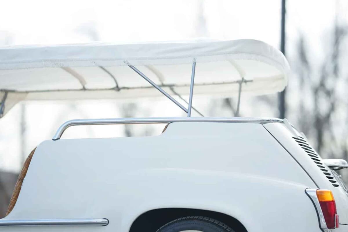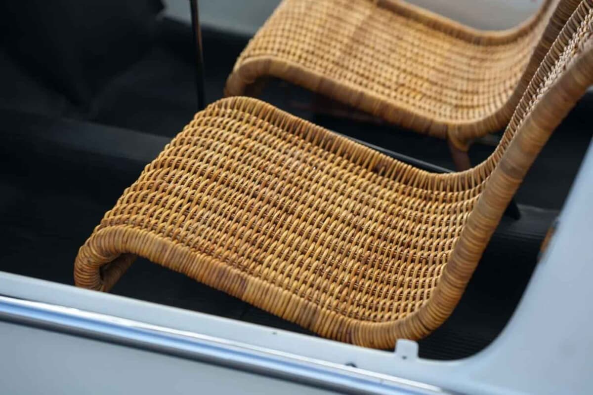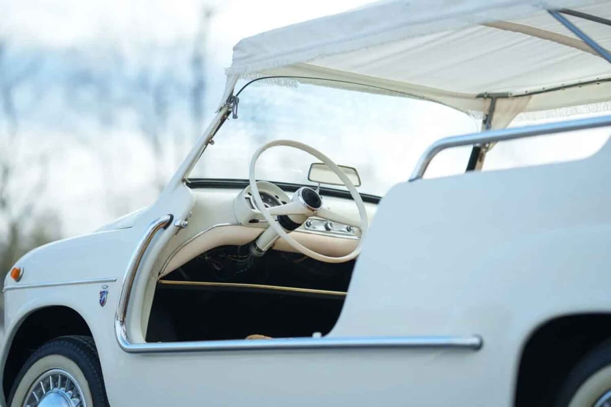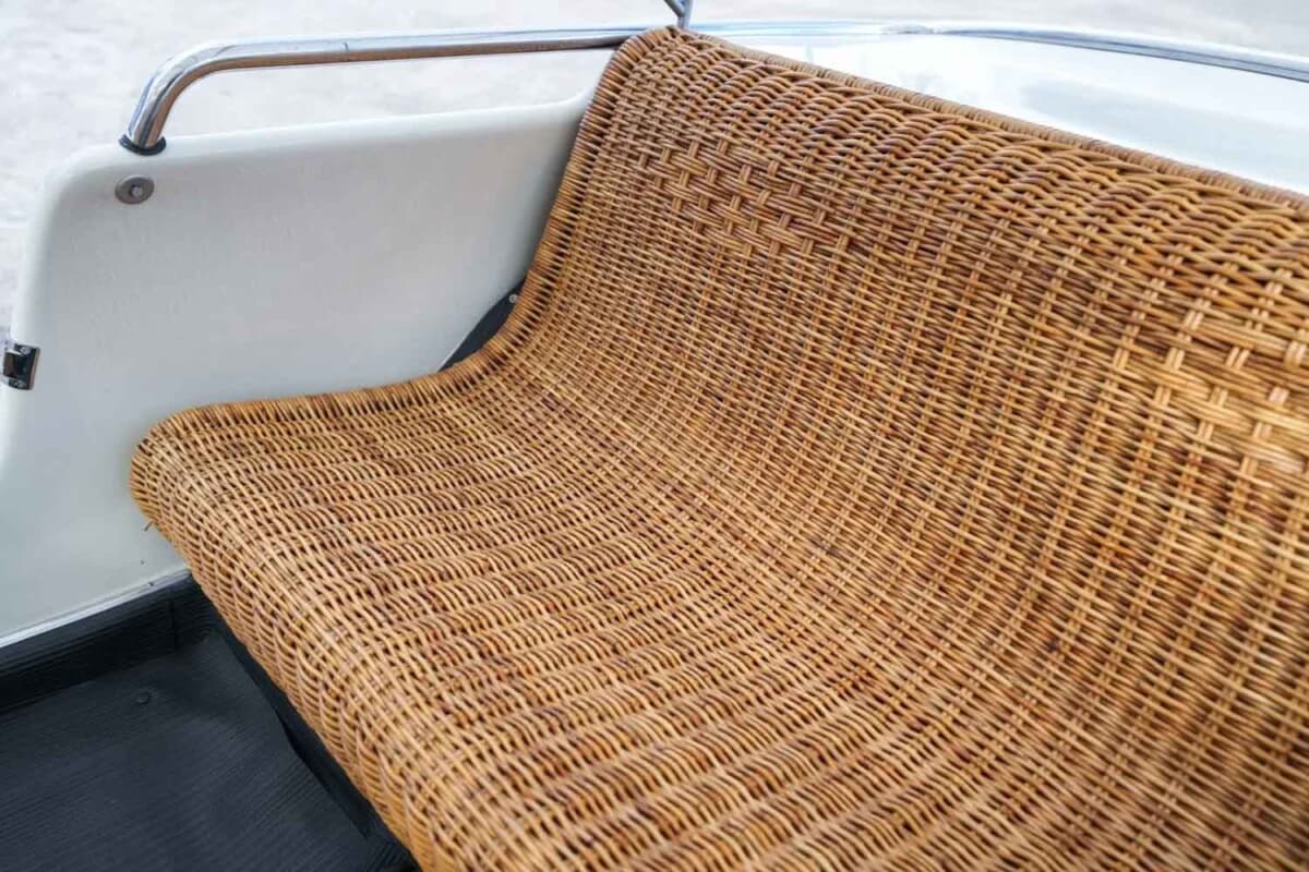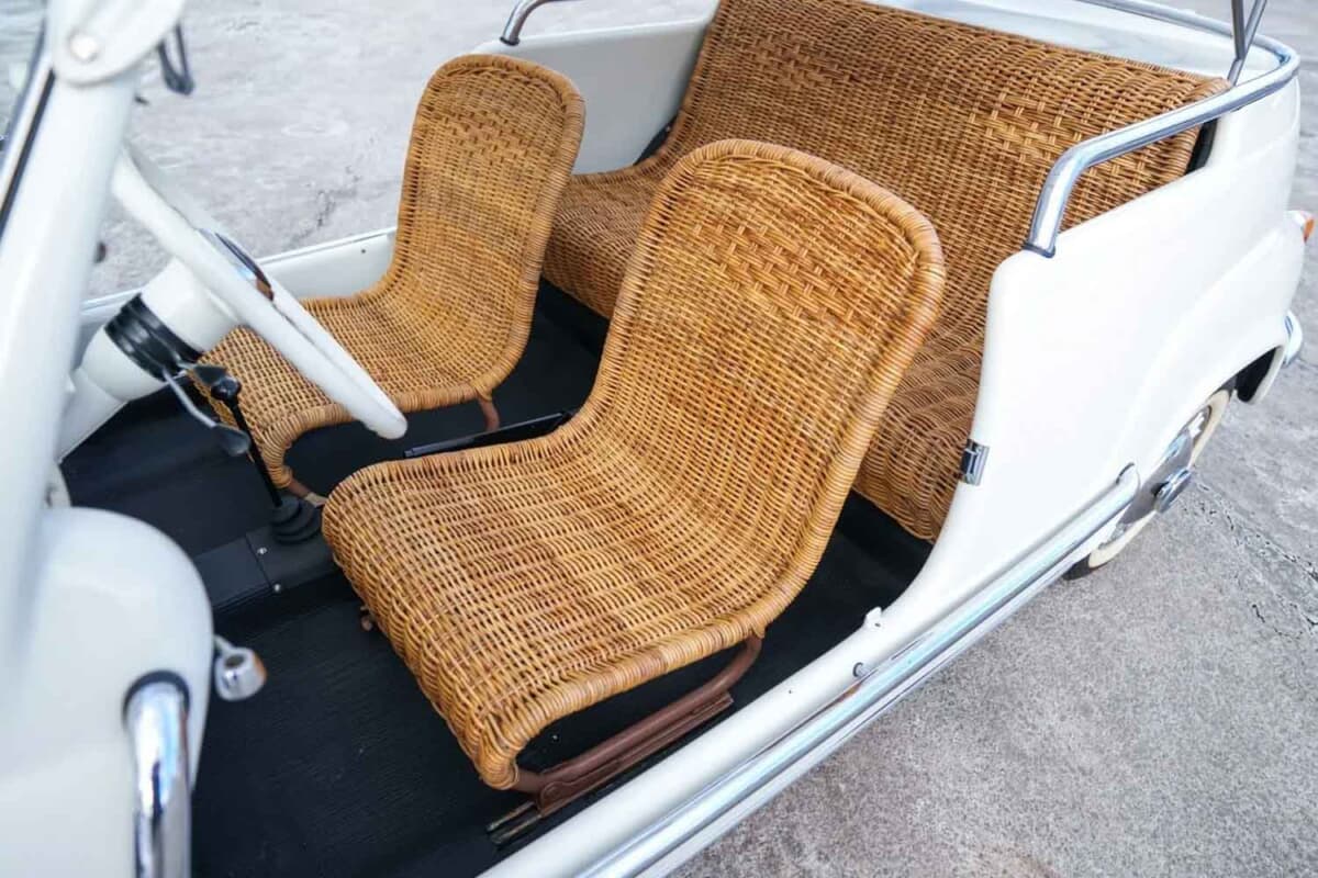 生まれ故郷であるイタリア語のジャンル名が示すとおり、濡れた水着のままでも乗車できるように、ドアが無く、ラタン(籐)で編まれたデッキチェア状のシートを前後に配している。ルーフはいさぎよくカットオフされ、ドアも取り去られた。代わりに、まるでレストランやカフェのようなタッセル(飾り房)付きの布製サンシェードを掛けたというのか、パラソルをさしたまま走るというのか、なんとも洒落たクルマである。