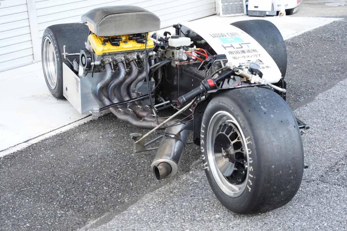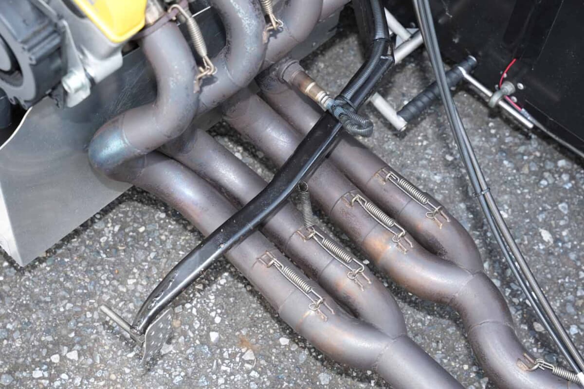 搭載は車両規定に沿ってリアミッドシップで、ドライバーのすぐ後方にエンジンが置かれ、マフラーは前方、すなわち前輪の後ろ近辺から排気する構造だ。このレイアウトを考案したのはフレームの製作者である熊野氏で、当初こそ異端だったが現在はこの仕様が世界的にもサイドカーの世界ではスタンダードとなっている。エキゾーストマニホールドはトルク重視の4-2-1タイプで、素材はマフラーを含め4輪でもよく使われるステンレス製だ。