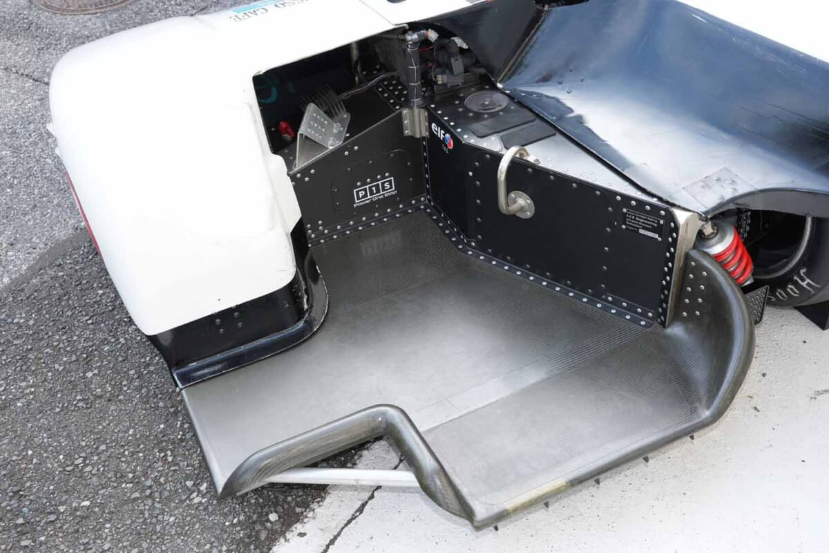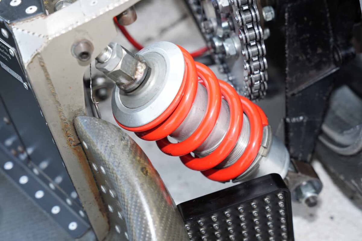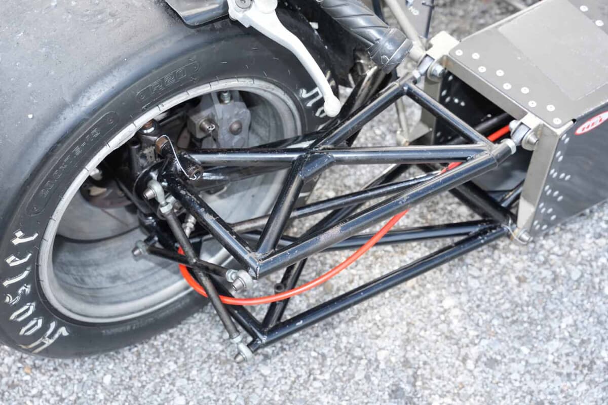 フロントサスペンションは4輪でいうダブルウイッシュボーンに近いが、レギュレーションにより90°変形させたような形状となる。リアはマシンの年式によって、リンクを介してモノコック内のユニットに繋ぐタイプと、アームに直接取り付けるタイプの2種類があり、冨本さんのマシンは前者だ。ダンパーはもともと4輪のF1用をベースにした特注品で、走行中に大きな姿勢変化を起こさないよう硬いスプリングが装着される。
