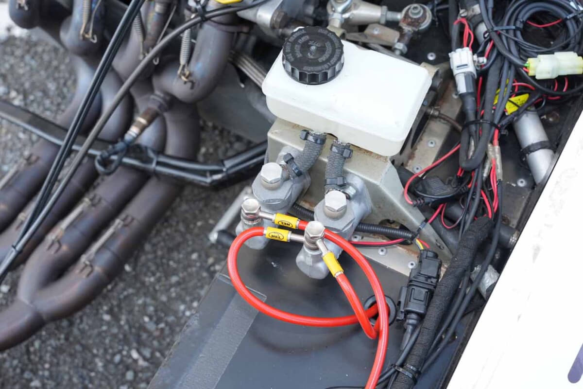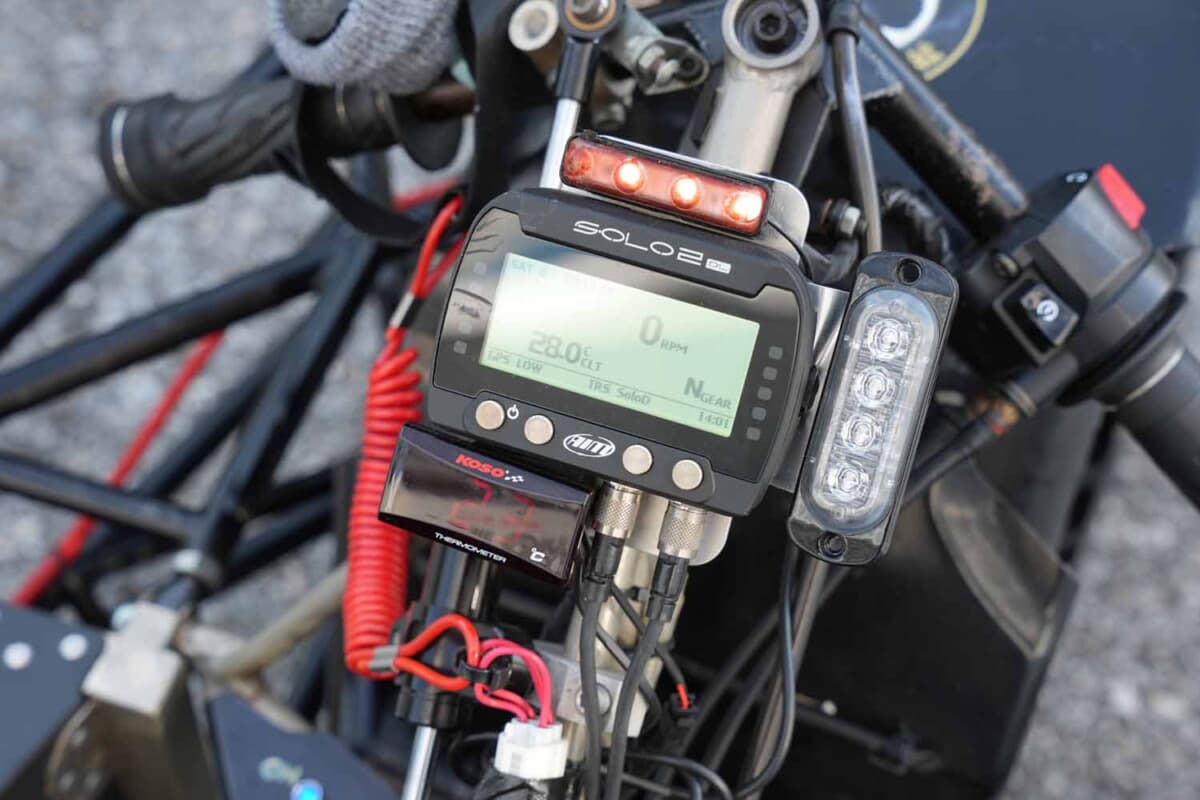 ブレーキはAPロッキード製で、1980年代のフォーミュラカーやミニクーパーのレースカーで使われていたものを流用しており、ハンドルのレバーではなくフットペダルでコントロールする。面白いのはマスターシリンダーが2つ存在する点だ。ひとつはフロント用、もうひとつはサイドおよびリア用で、手元のダイヤルをドライバーが走行中に操作してブレーキバランスを調整する。ドライ路面ではフロント重視のセッティング、グリップの低いウエット路面では3輪を均一にするなど、この味付けもドライバーの腕の見せどころといえる。