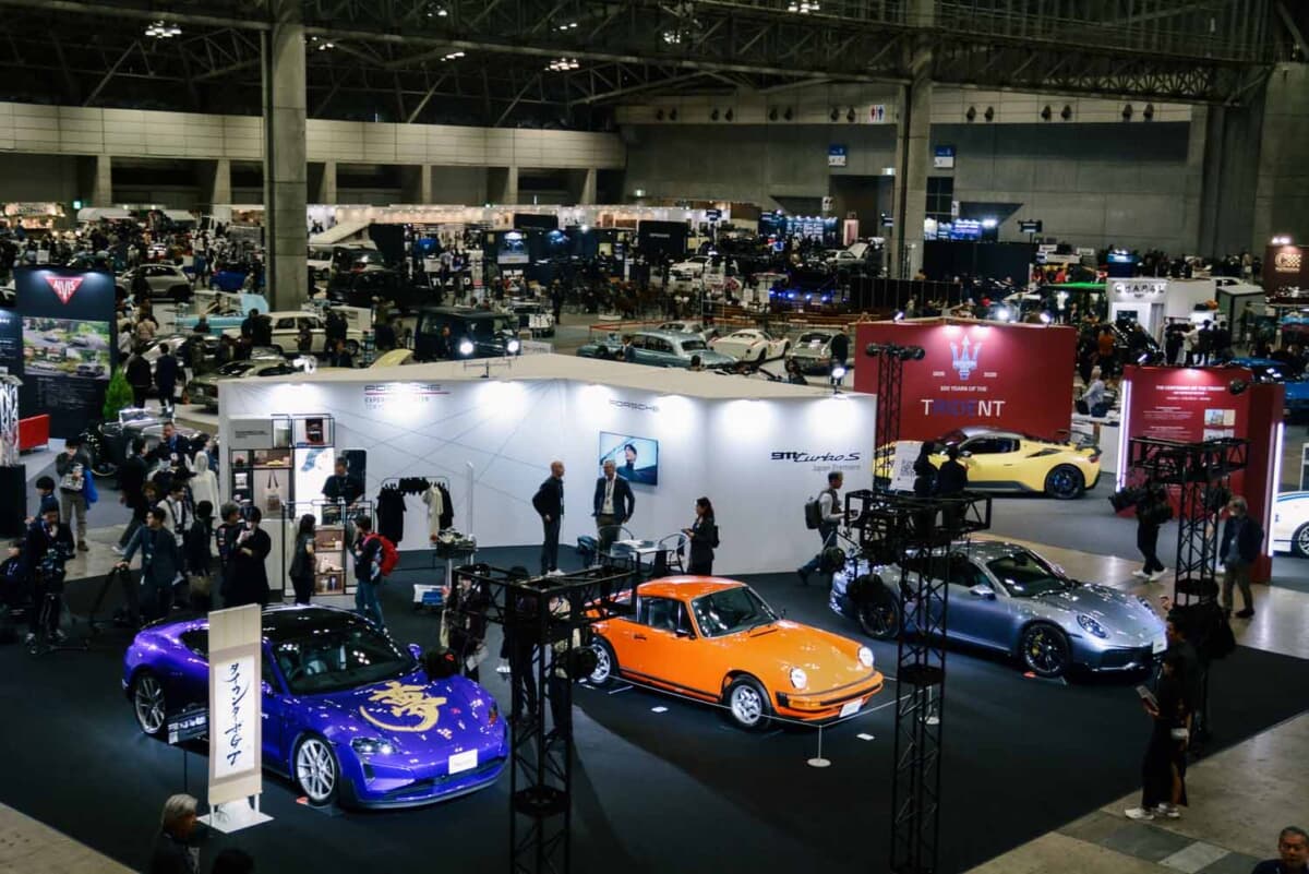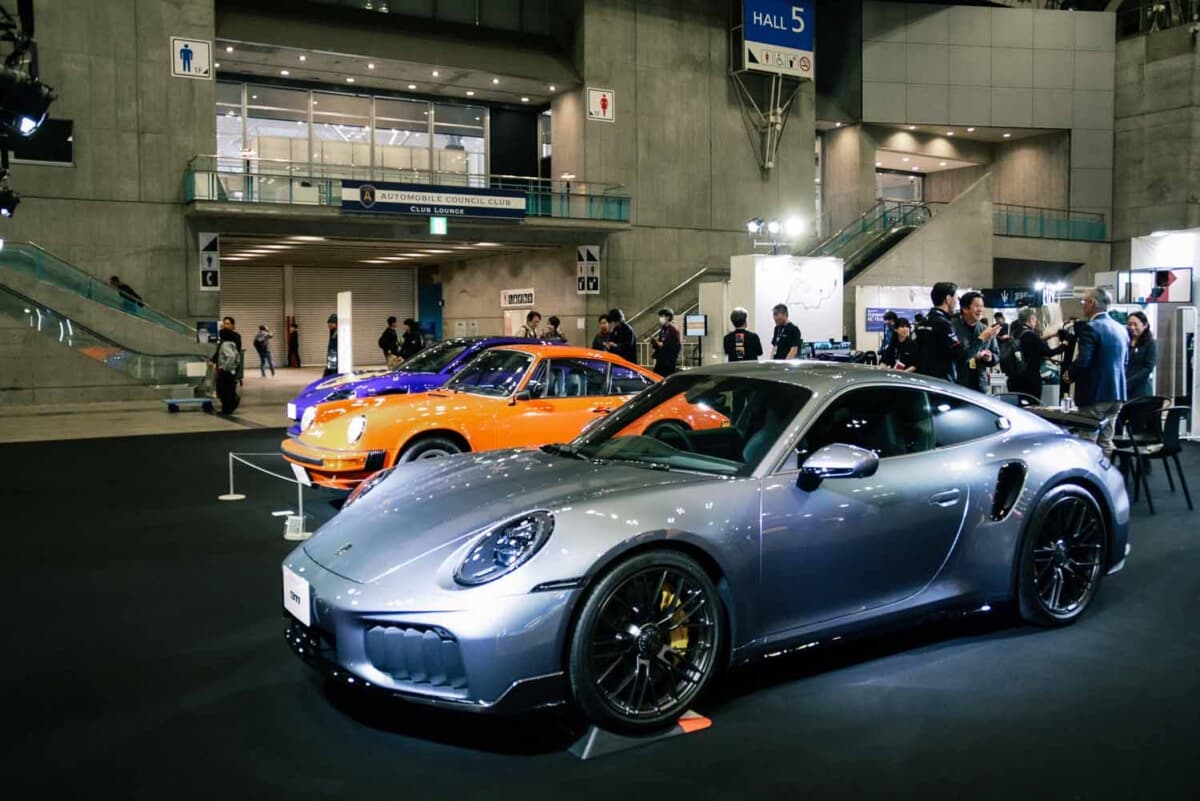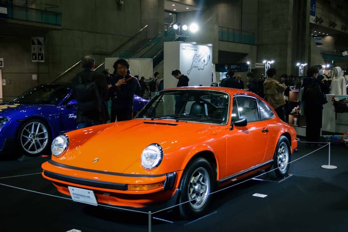 エスカレーターでメインゲートからホールに降りると、いきなり目に飛び込んでくるのがポルシェのブースだ。千葉県木更津市にある大型ブランド体験施設「ポルシェ・エクスペリエンスセンター(PEC)東京」をイメージさせる空間設計が来場者を出迎える。ブースの両脇には、未来を象徴する電気自動車(BEV)「タイカン ターボGT」と、T-ハイブリッドドライブテクノロジーを搭載した新型「911ターボS」が並ぶ。そして中央には「ポルシェクラシック」から、鮮やかなオレンジ色の1976年式「911」クーペが展示され、新旧モデルがよく似たシルエットを並べている。