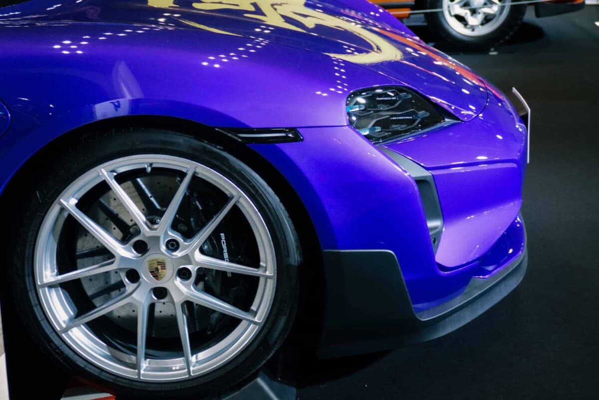 いっぽう、左端に展示されたタイカン ターボGTは、通常時580kW(789ps)を発揮し、ローンチコントロール使用時には760kW(1034ps)へと跳ね上がる。さらに最大2秒間のオーバーブーストパワーでは815kW(1108ps)をマークする、現時点における最速のポルシェ市販電気自動車である。2026年3月1日に開催された「東京マラソン2026」では、審判長車として先頭ランナーに追走したオフィシャルカーでもある。