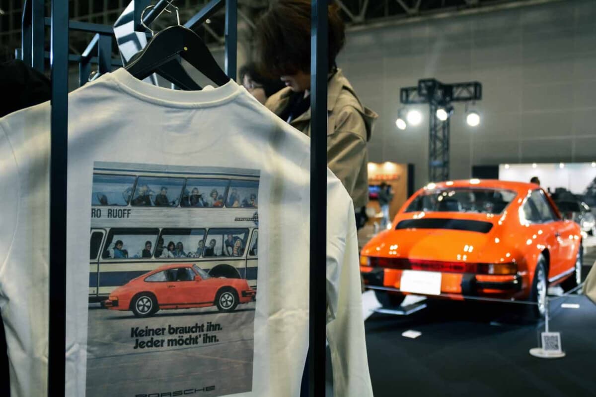 「オートモビルカウンシル2026」の大会初日である4月10日、ポルシェのライフスタイルブランド「ポルシェライフスタイル」に新たな「レトロコレクション」が追加され、この会場にて初公開された。この新作コレクションには、オレンジ色でナローフェンダーのGモデル「911 2.7」を描いたイラスト入りのロングスリーブTシャツやトートバッグなどが含まれている。そのため、日本のポルシェクラシックが国内で似たスペックの個体をわざわざ探し当て、イベントに出展したという。