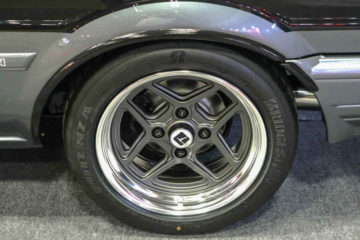 ホイールはもちろんTOM’Sといえば、の「井桁(イゲタ)ホイール」だが、正確には「IGETA REVIVAL」のネーミングで、昔ながらのデザインをベースに新造された2ピースの鍛造ホイールだ。単なるデザインの復刻にとどまらず、現代の高度な鍛造技術を用いることで、当時の鋳造モデルを凌駕する高い剛性と軽量化を両立させている。ディスクカラーはホワイトとゴールド、そしてガンメタリックの3タイプが用意されている。