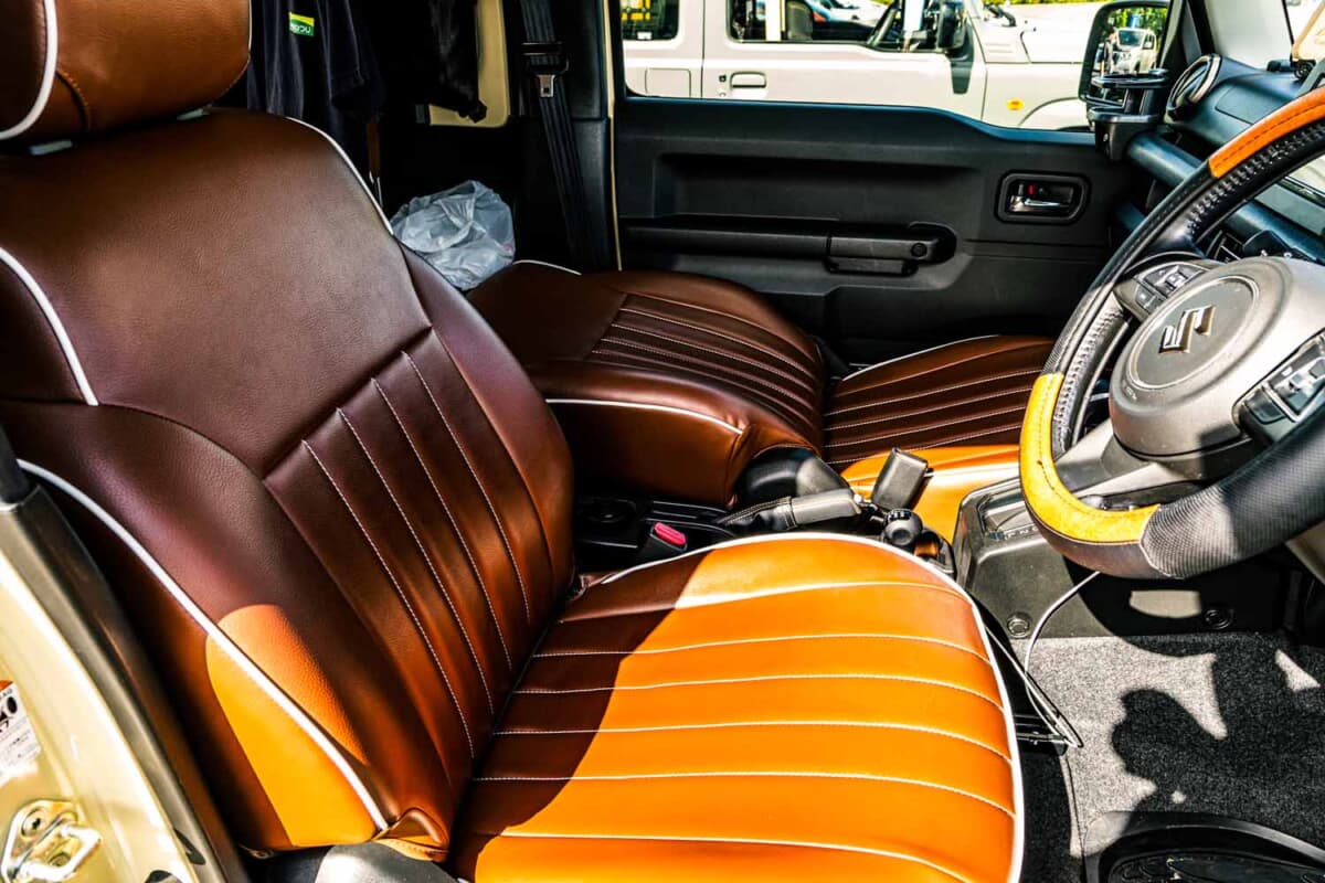 • スズキ ジムニー:シートにはカバーを装着している。ほかにもウッドパネルなどへの変更を検討中だという