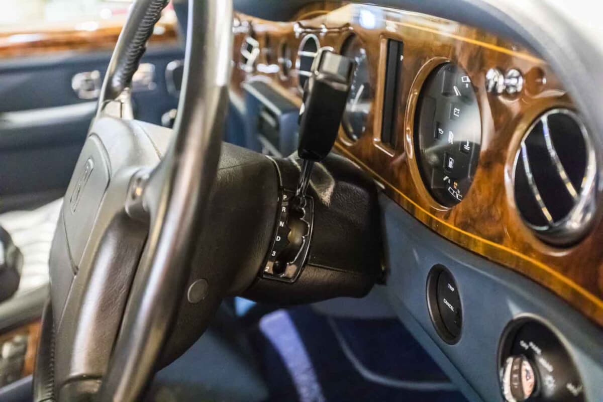 それが証拠に車内を見せてもらうと、スピードメーターはマイル表示ではなくキロ表示となっている。おそらく一般的な日本輸出仕様である可能性が高い。ルーフにはボディ同色のレザートップが貼られている。これは車内の静粛性を向上するための装備で、この車両は状態も非常に良い。また大使館の車両らしく、左フロントフェンダーにはフラッグポールが備わるのが特徴と言えるだろう。