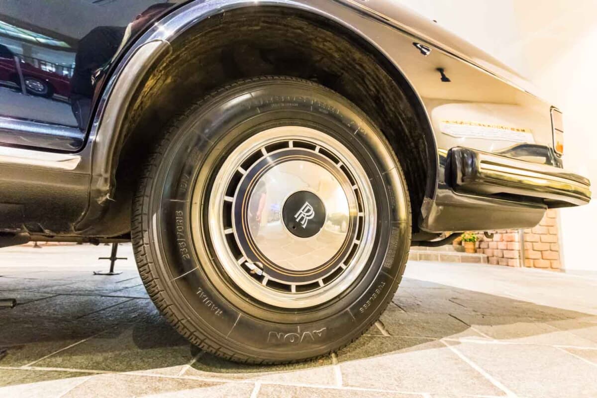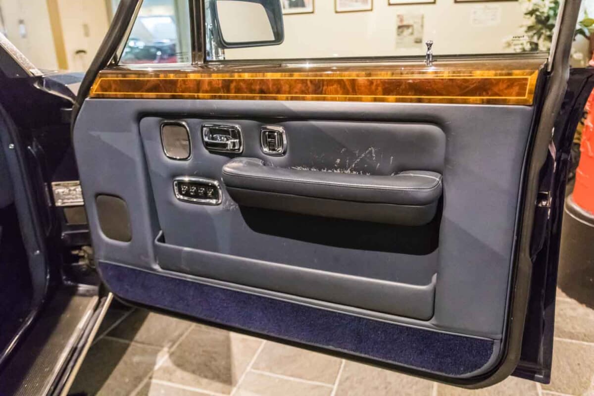 さて、日本自動車博物館に展示されている車両を細かくみていこう。圧倒的な威厳を放つフロントマスクには、ロールスロイスの象徴である神殿をモチーフにした「パルテノングリル」と、その頂に立つマスコット「スピリット・オブ・エクスタシー」が鎮座している。美術品のような美しさと、VIP送迎車としての揺るぎない風格をひしひしと感じさせるが、車両をさらに細部まで確認していくと、驚くべき事実が隠されていた。
