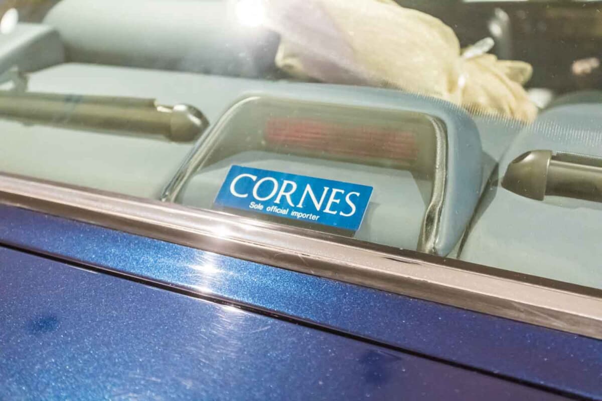 なんと、リアウインドウ中央に「CORNES(コーンズ)」のステッカーが貼ってあるのだ。つまり英国大使館は本国からこのクルマを持ち込んだのではなく、日本で現地調達していることになる。