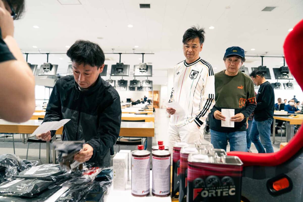 走行後のミーティングでは、NAPAC加盟社から提供される豪華景品が当たる抽選会も開催された。タイヤやホイール、スポーツシート、ブレーキパッドといった、クルマ好きが憧れる品々が並んだ。さらに加盟企業が協賛した製品やグッズが参加者全員にプレゼントされるため、抽選に外れても手ぶらで帰ることはない。