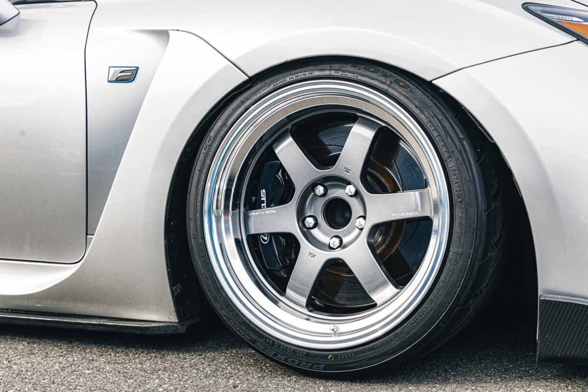 「アームは強度を考えたとき安心かということで、フロントのアッパーアームはレクサスIS用の純正を流用しています。キャンバーはあまり付けたくなかったので4度通しぐらいにして、タイヤをなるべく太くしたかったのでホイールはVOLK RACINGの18インチで10.5J通しです。18インチにしたのはブレーキとのクリアランスを狭めたかったのと、タイヤを厚くしたかったので。タイヤは価格と性能のバランスが良く、タイヤパターンもカッコいいし、グリップ性能も考えてPROXES R888Rにしました」
