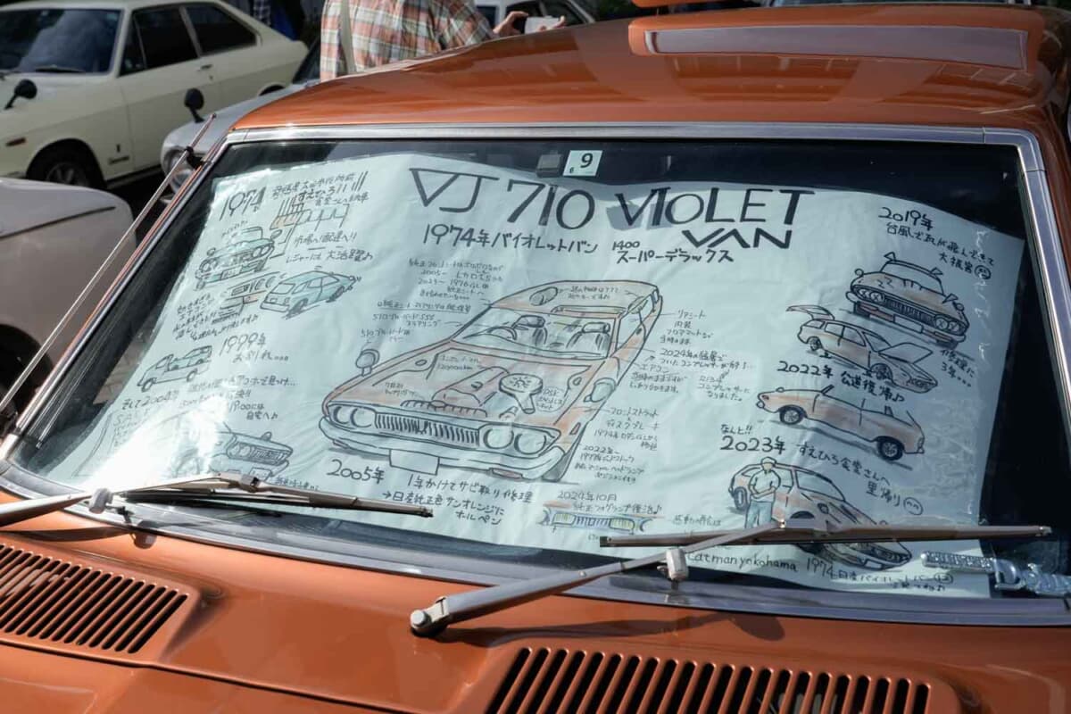 • 日産 バイオレットバン:最初の嫁ぎ先から現在までの変遷が、オーナーの井田さんによる手書きイラストで紹介されている