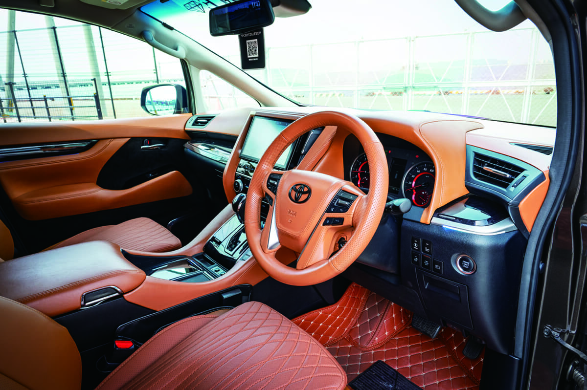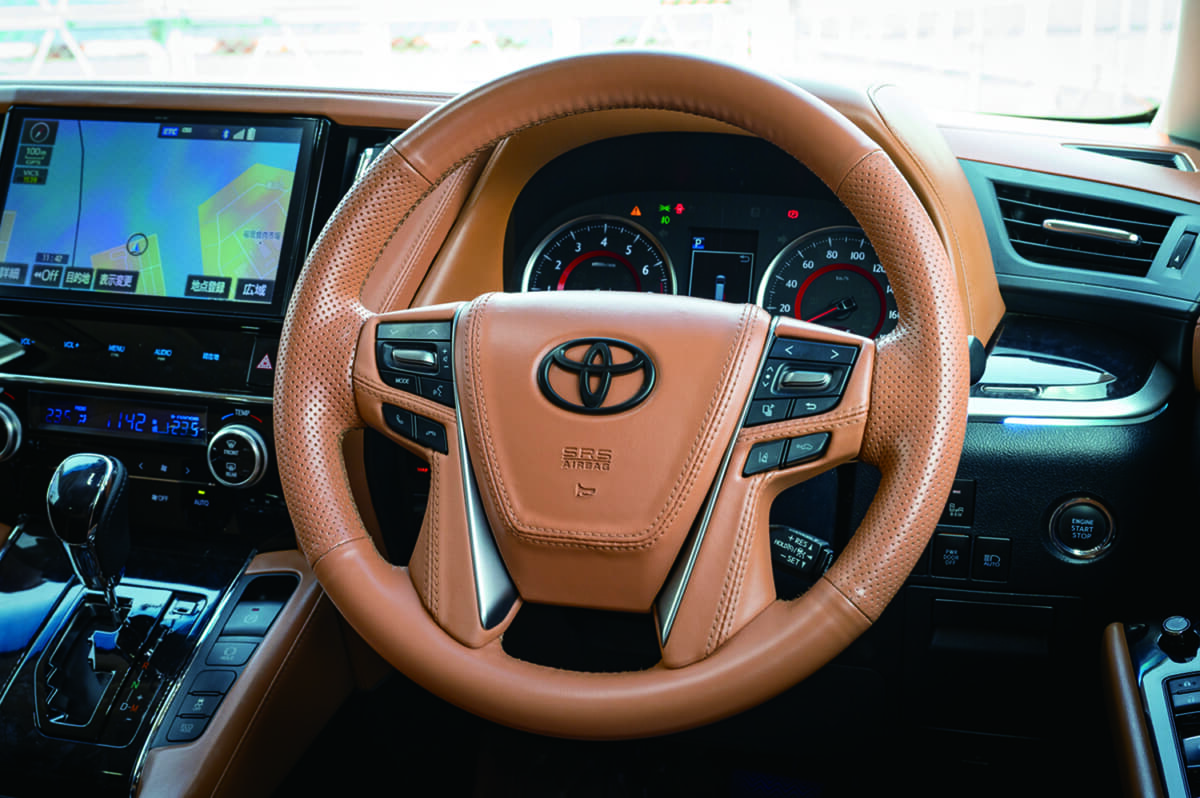 • トヨタ アルファード:キャメルの内装はプレミアムなイメージ満点。ステアリングは210クラウン用で、アルファードの純正スイッチ機能を移植
