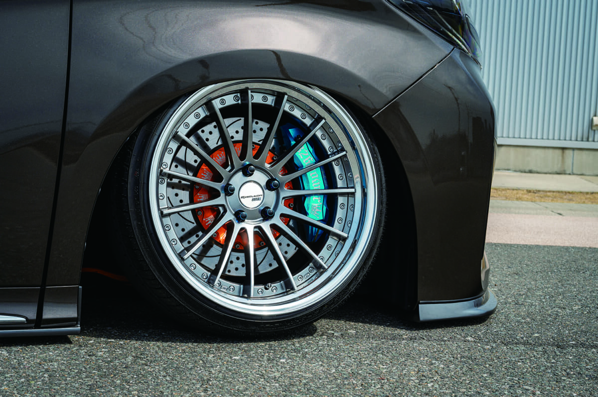 • トヨタ アルファード:SSRエグゼキューターCV04S(Ⓕ20×10・-1:Ⓡ20×10・-14) の奥には380φの326パワー製ブレーキユニットを装着。キャリパーはフロント8pot、リア6pot。ホイールの開口部いっぱいにブレーキローターが埋め尽くされインパクトも絶大