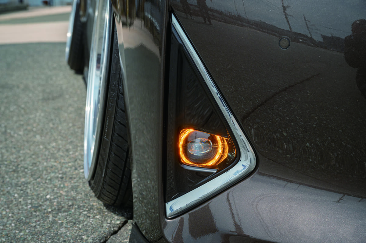 • トヨタ アルファード:デイライトとウインカーの切り替え発光が可能なフォグランプも、クリスタルアイの製品。さらにやんやんサンはDIY加工でドア開閉と連動した点滅機能を持たせている
